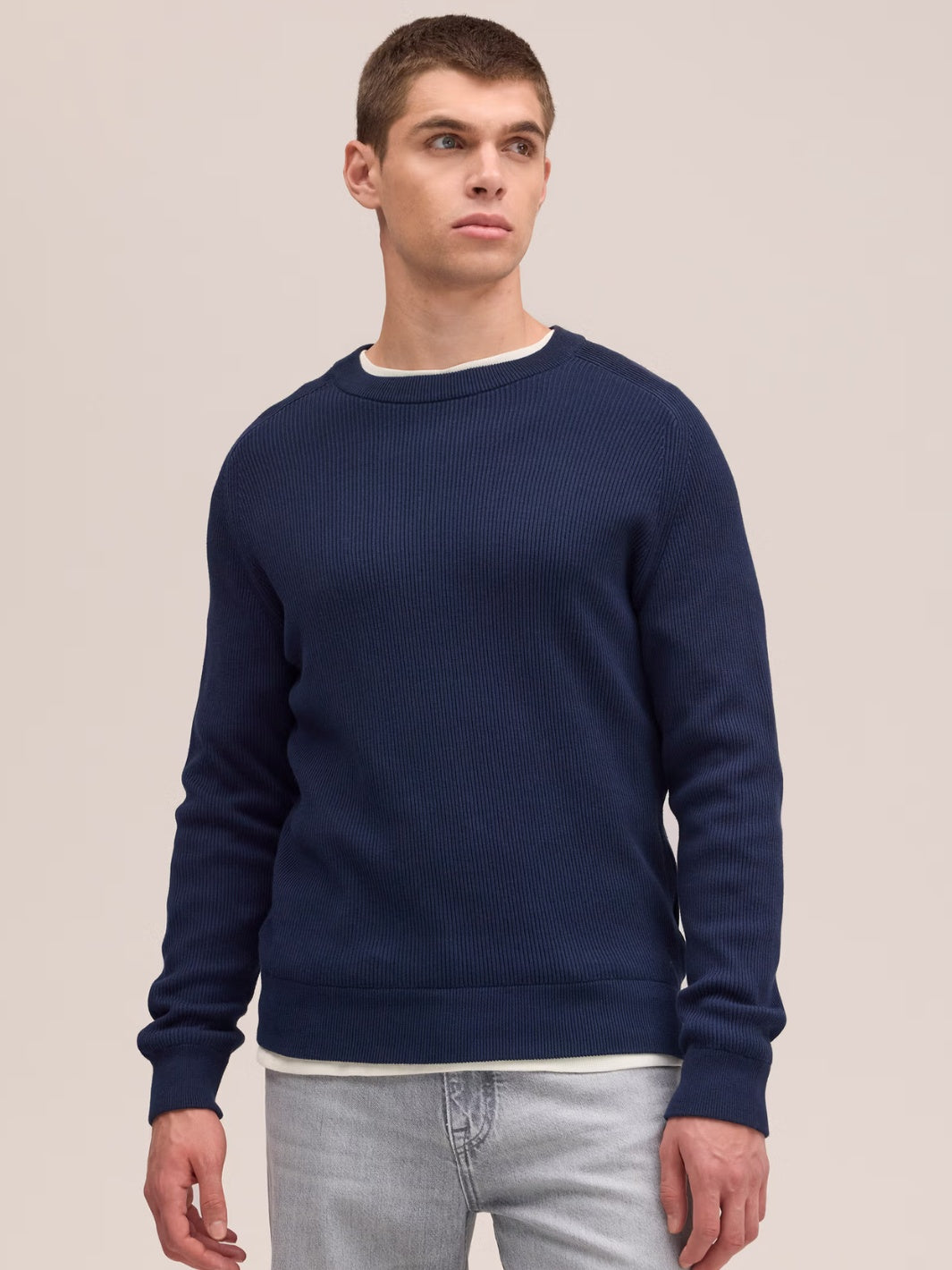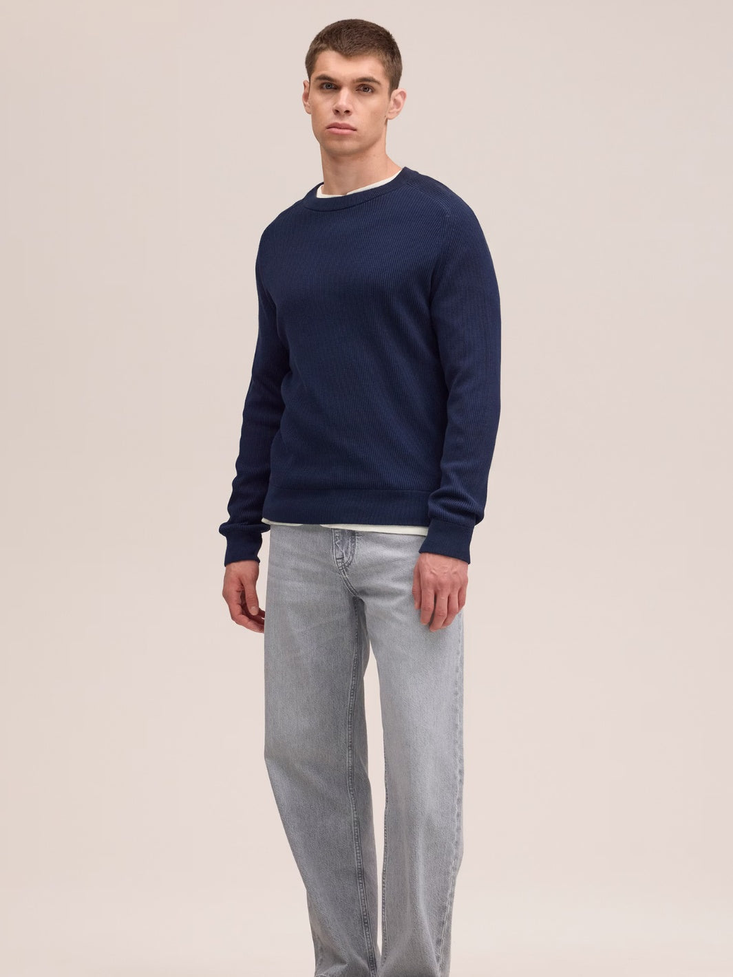 Kevin Ribbed Sweater fra NN07. Strikket genser med rund hals, her i marineblå. Genseren er laget av 100% bomull og har ribbet struktur.