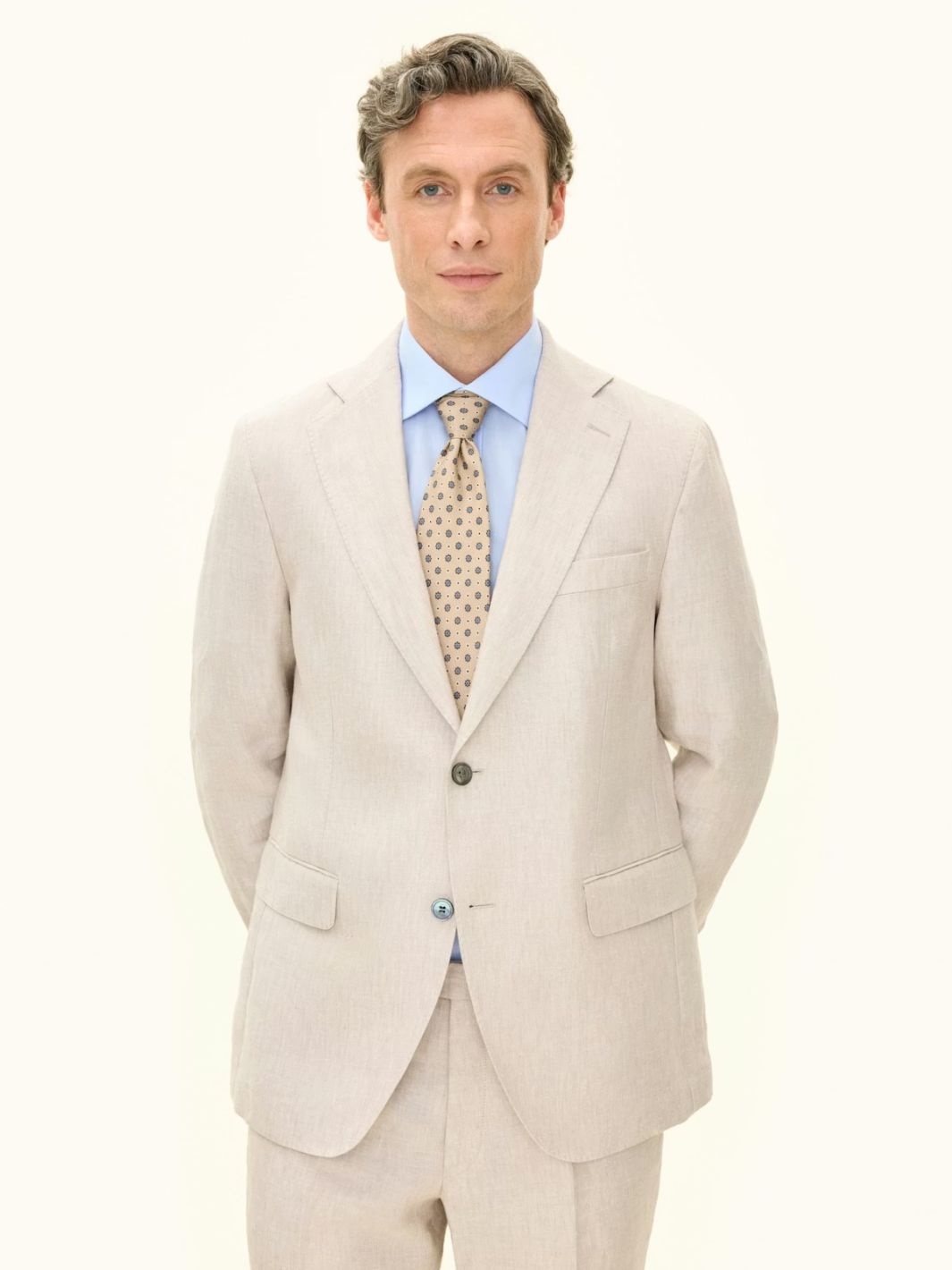 Ferry Soft Blazer fra Oscar Jacobson. En klassisk beige dressjakke av ren lin. Dressjakken har ukonstruerte skuldre og lommeklaffer, som sammen med halvfôringen gir en luftig og behagelig jakke.
