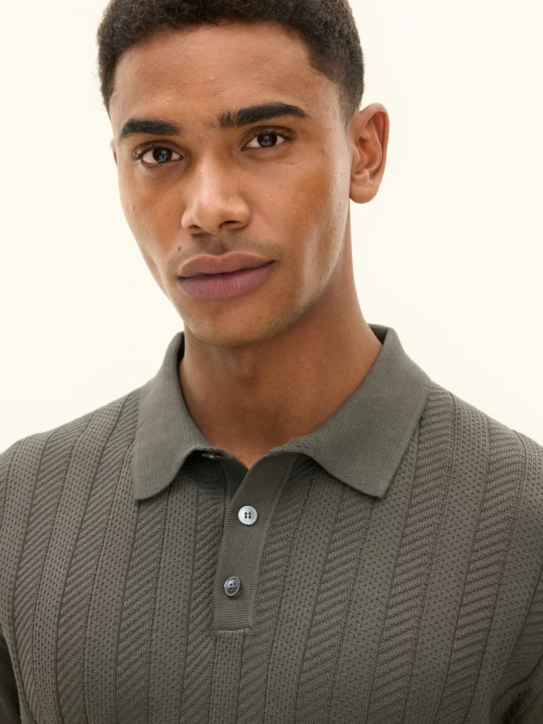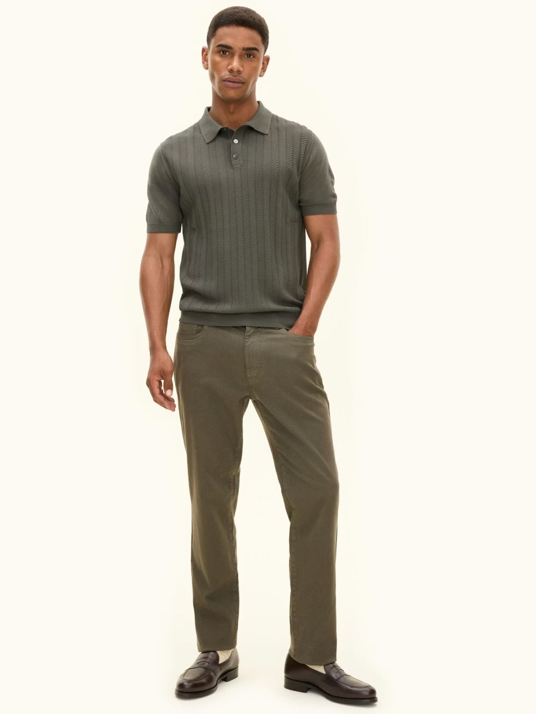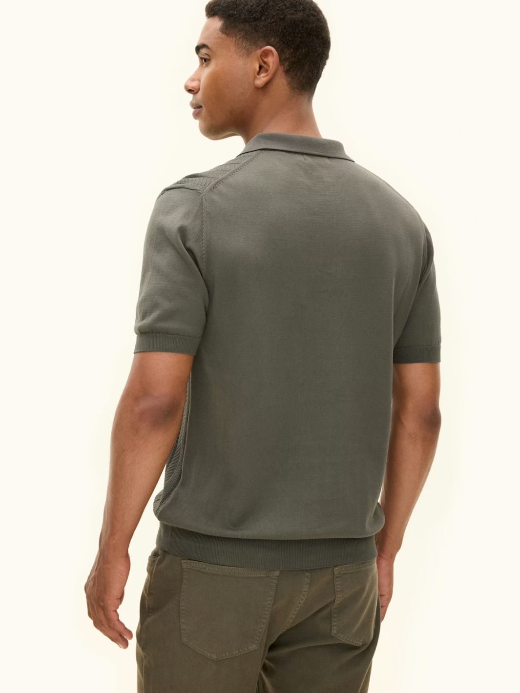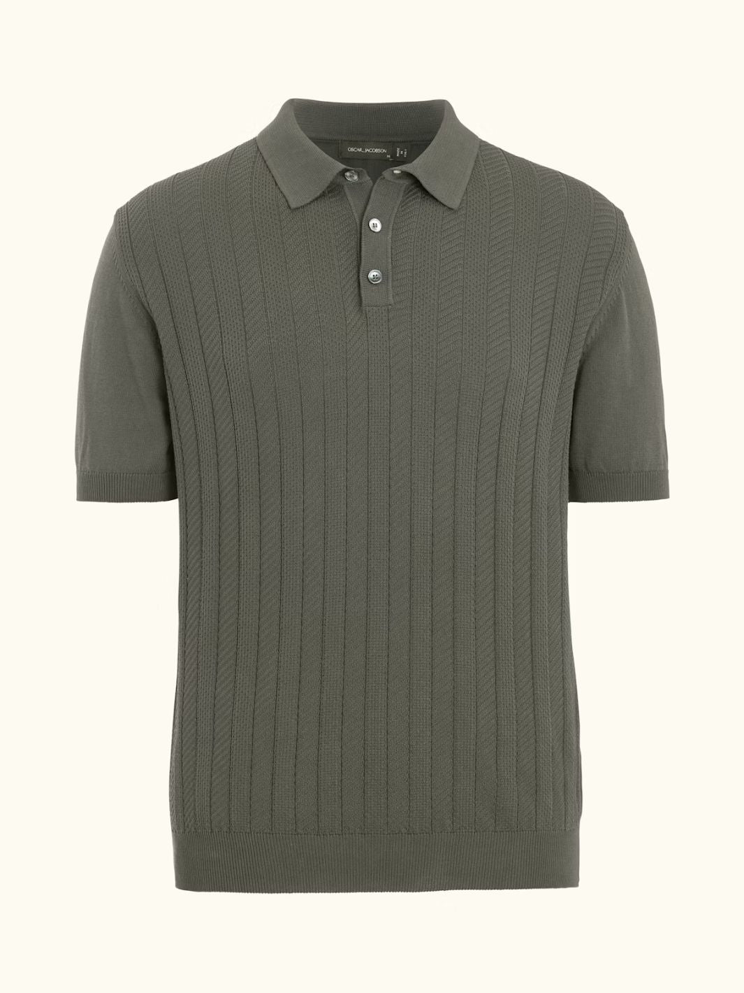 Barto Pique fra Oscar Jacobson. Lekker polo skjorte med vevet-struktur, her i grønn. Skjorten har en fasongstrikket krage og tre perlemorsknapper i front.