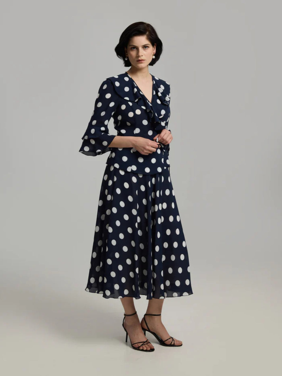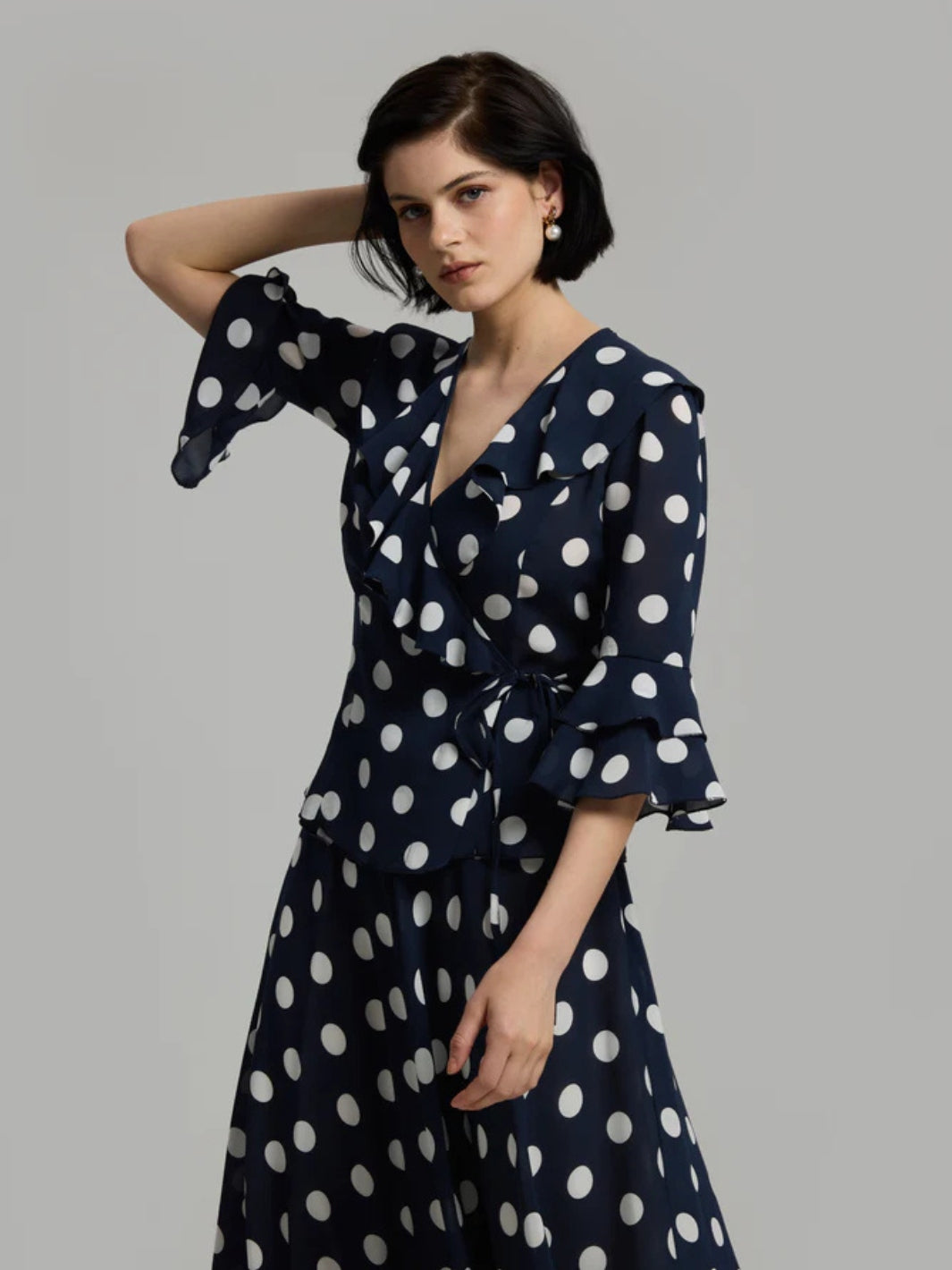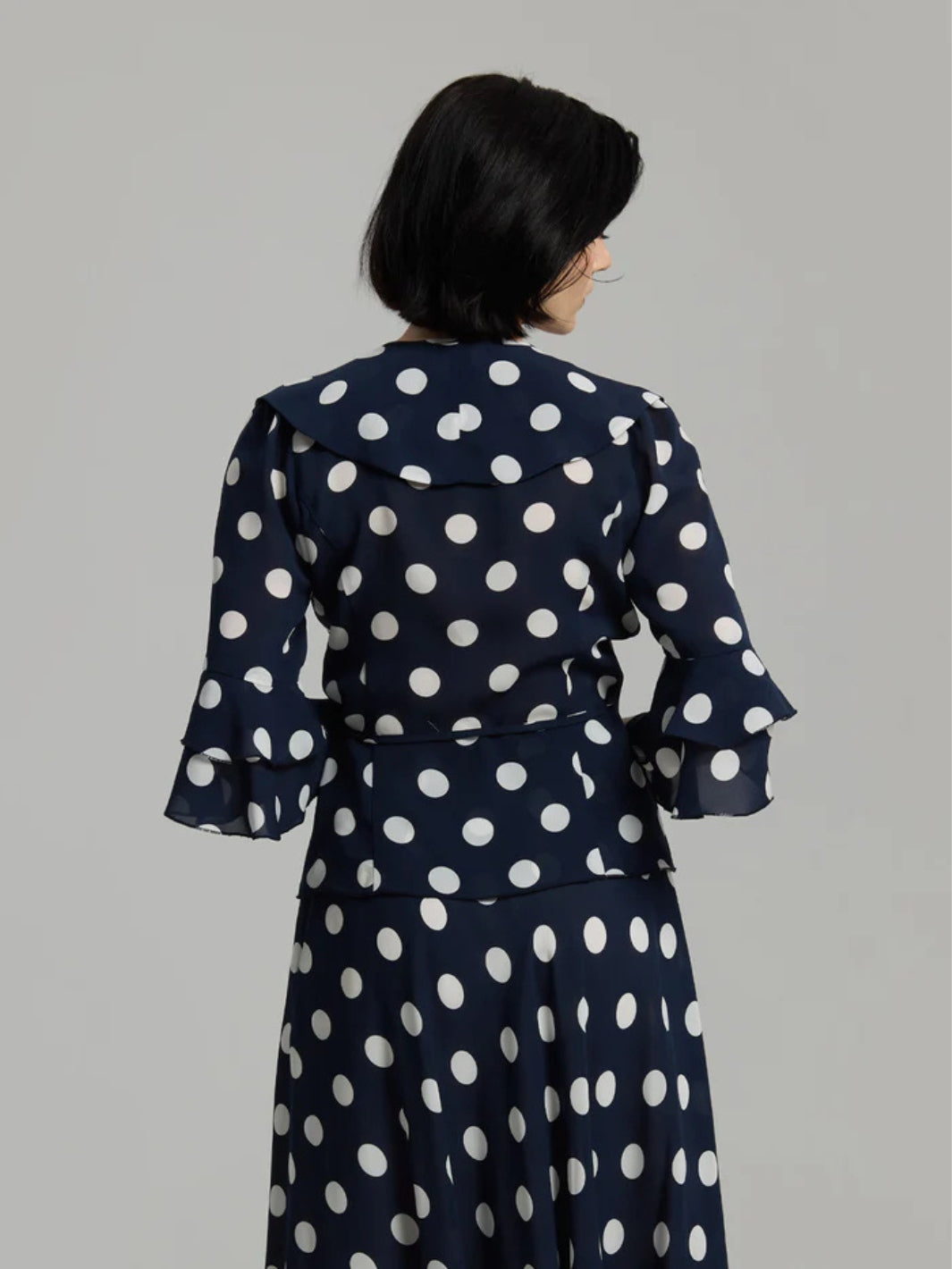 Yendi Blouse fra Andiata. Elegant omslagsbluse med justerbare knytebånd i siden. Blusen har volangdetaljer ved krage og mansjetter som tilfører et feminint og sofistikert uttrykk. Kombiner med Fanny Skirt fra samme merke for et komplett sett.