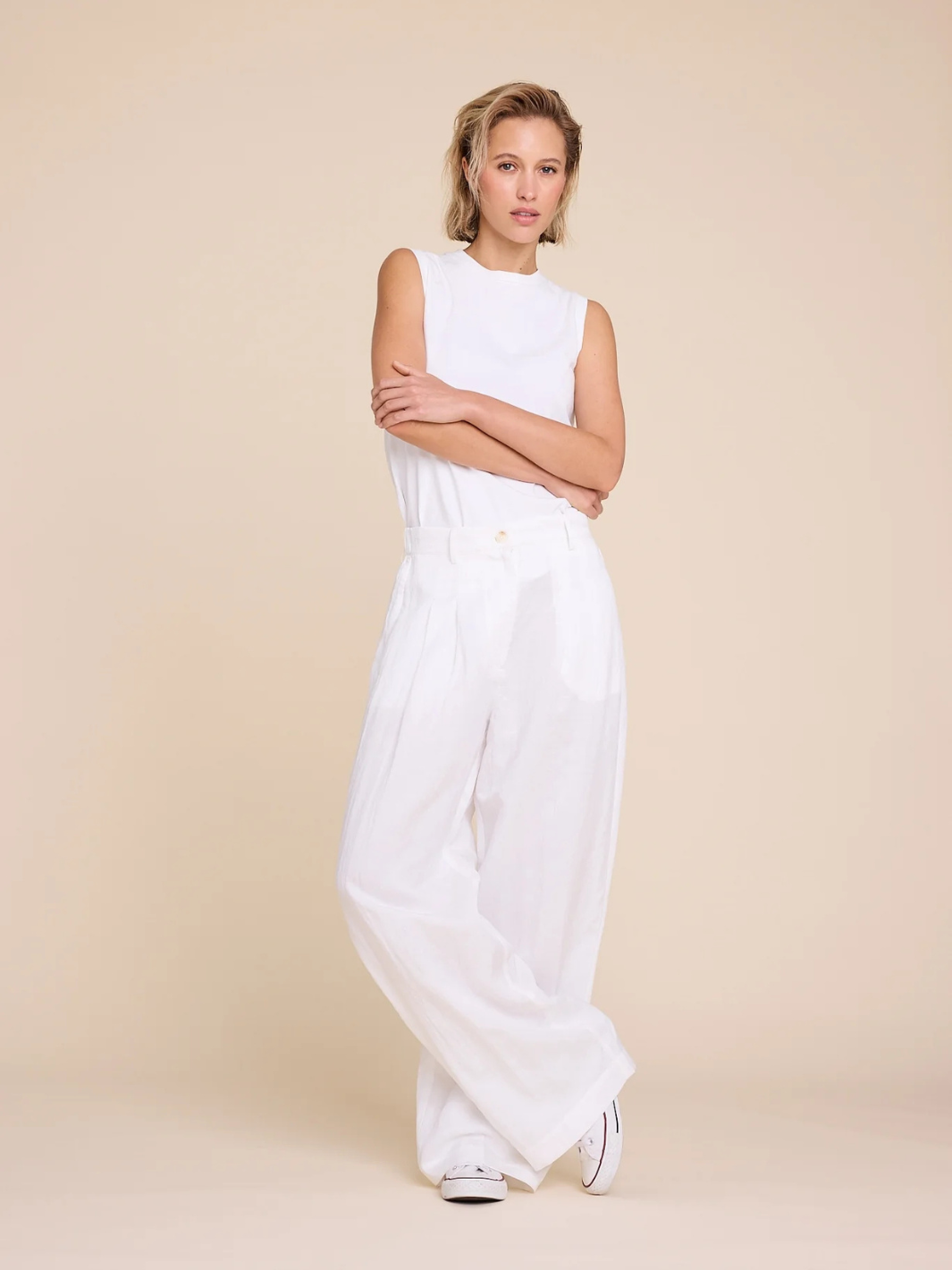 Ursula Linen Trousers fra Line of Oslo. Lekre hvite linbukser med diskret legg foran, elastisk linning bak samt side- og baklommer. Kombiner med West Linen fra samme merke for et komplett sett.