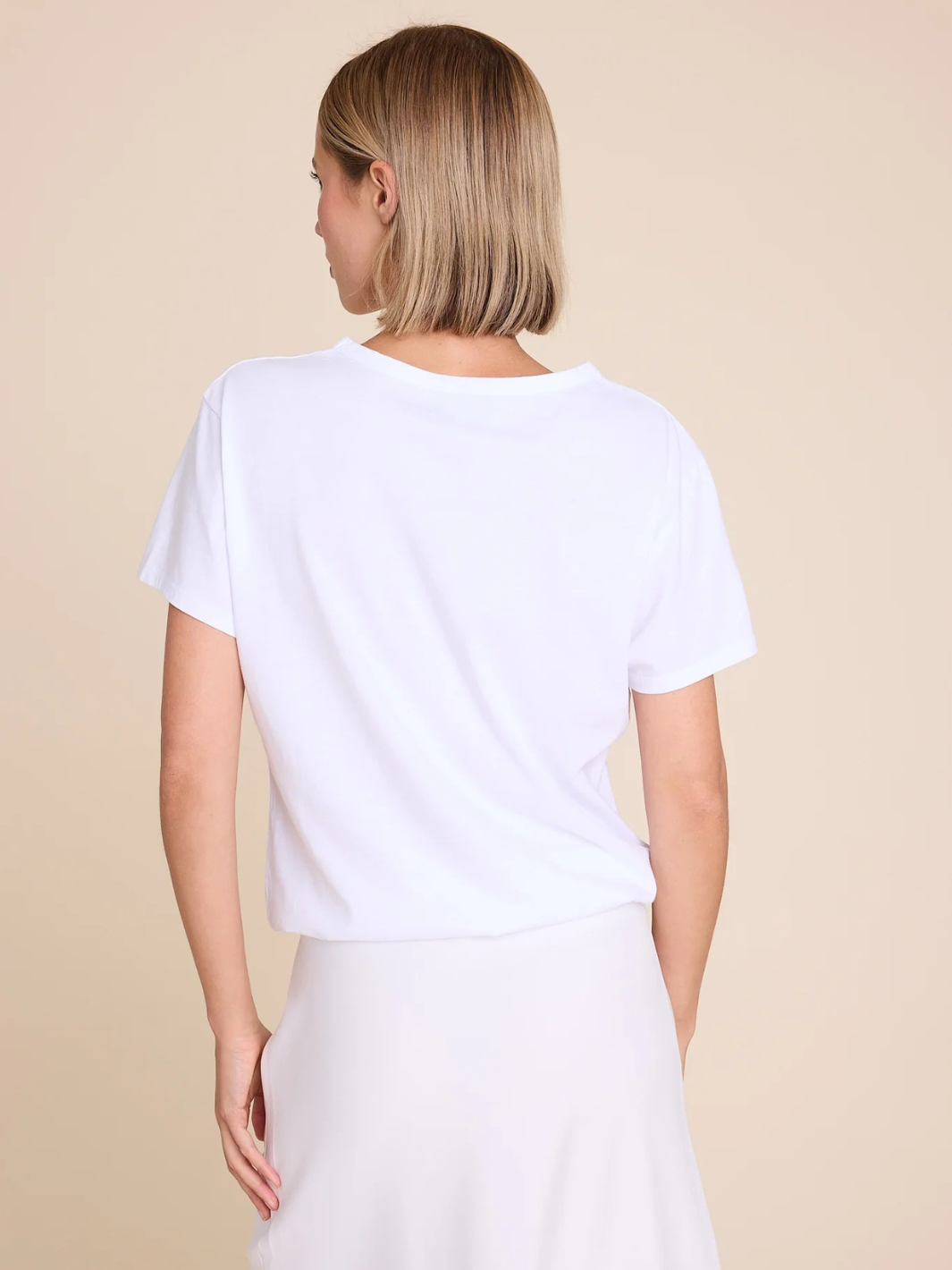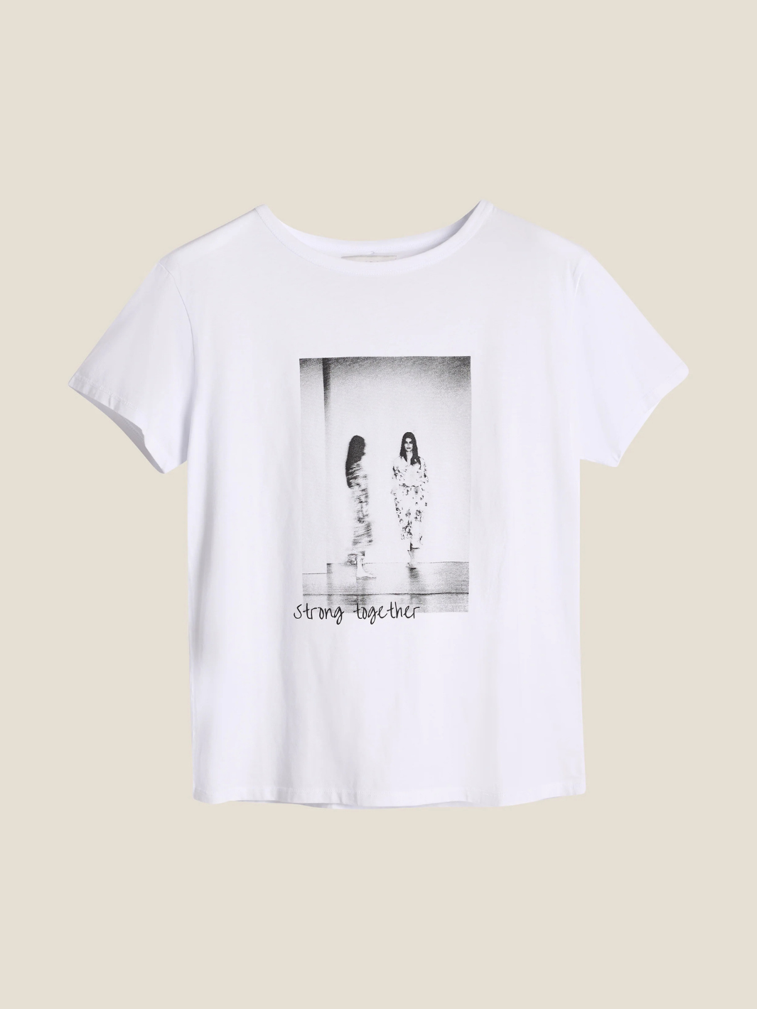 Famous T-Skirt fra Line of Oslo. En hvit t-skjorte med rund hals og en flatterende rett passform. T-Skjorten har et statement-print “Stronger Together”.