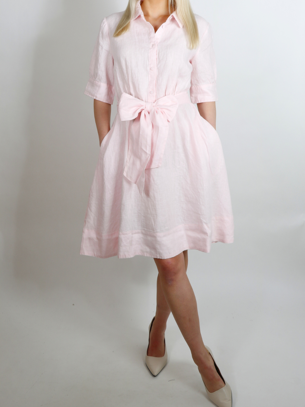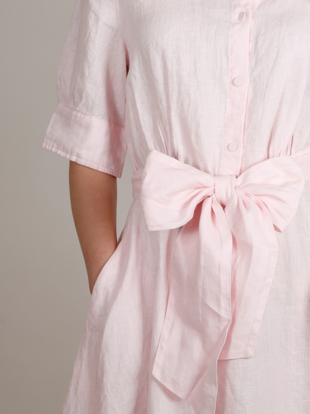 Rosy Linen Dress fra Alma. En rosa kjole med korte ermer og knapper i front. Kjolen har en a-formet silhuett og knytebelte i midjen.