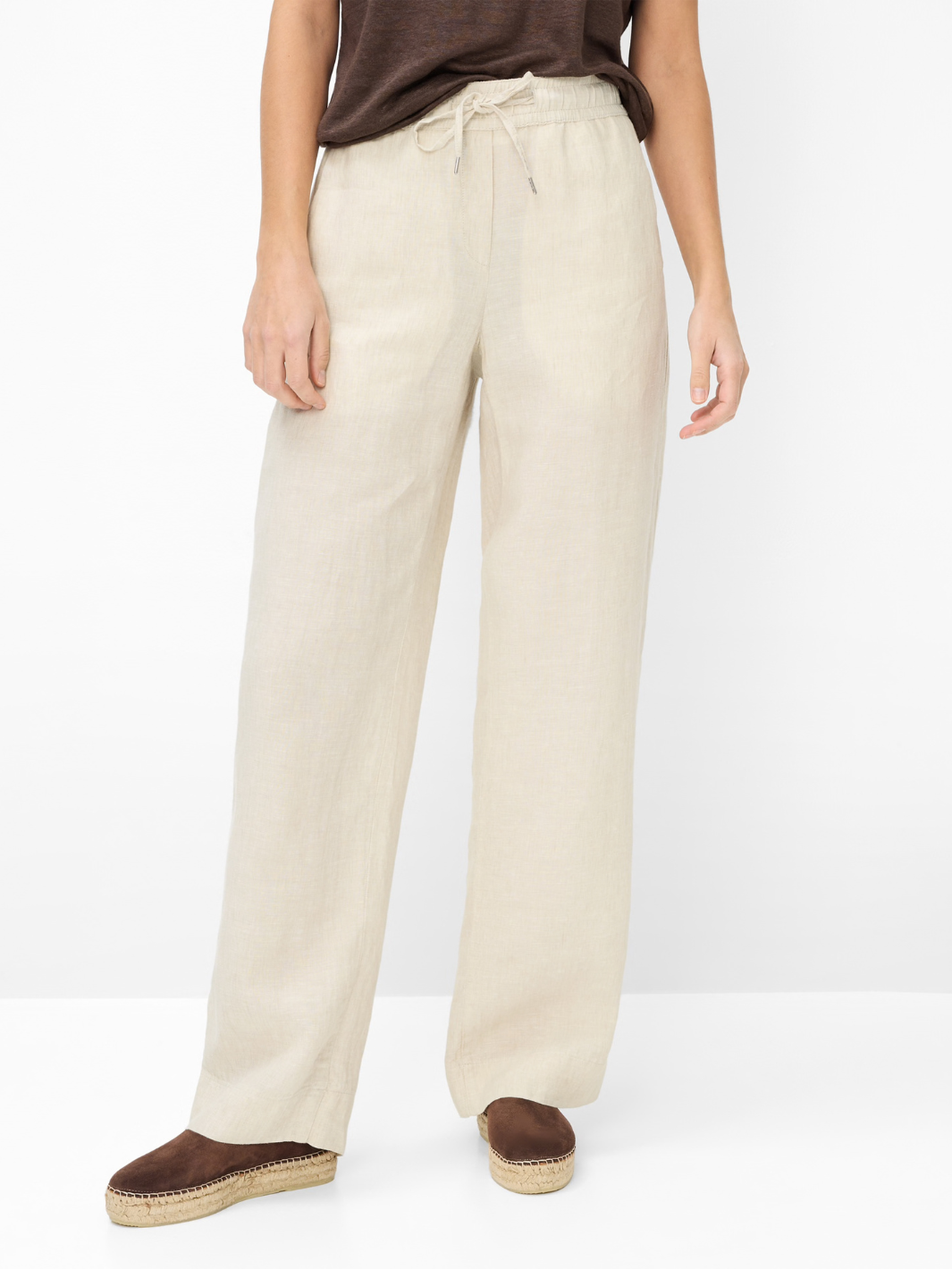 Farina Trousers fra Brax. Beige linbukser med elastisk linning og utsvingte ben.