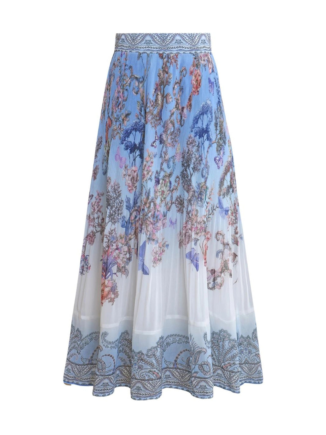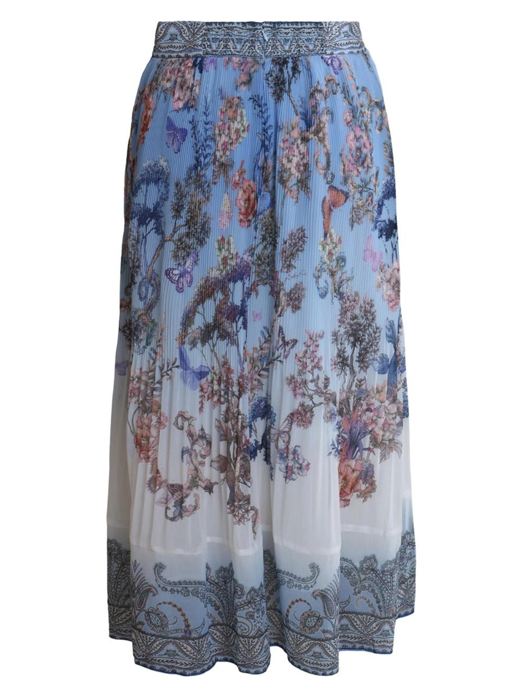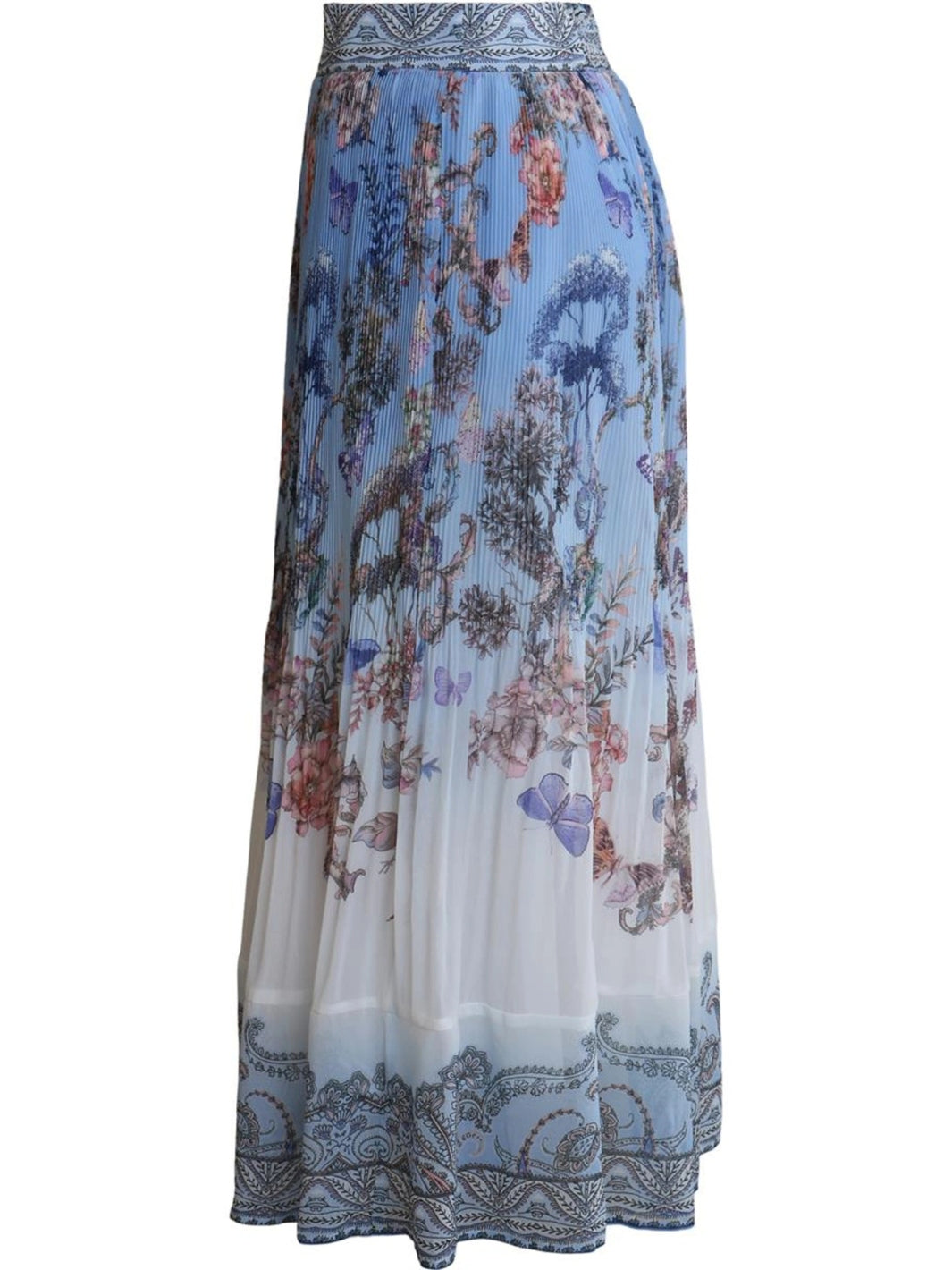 Theodosia Skirt fra Hale Bob. Et luftig og langt skjørt med smal midje, detaljert med et blått blomsterprint.