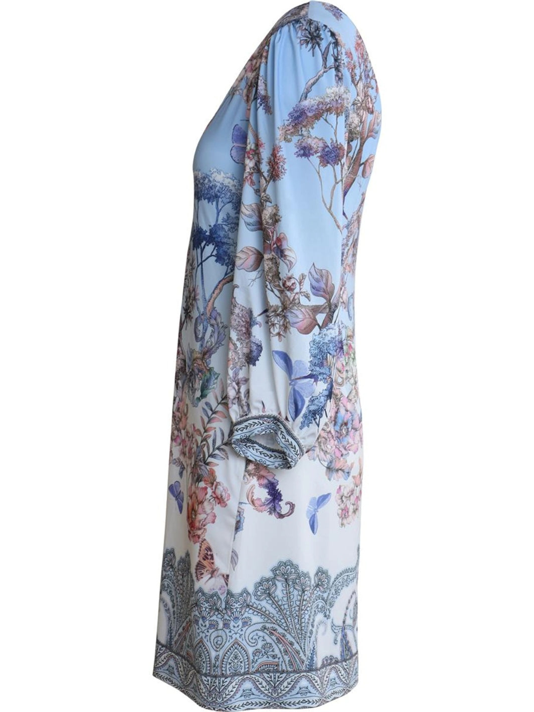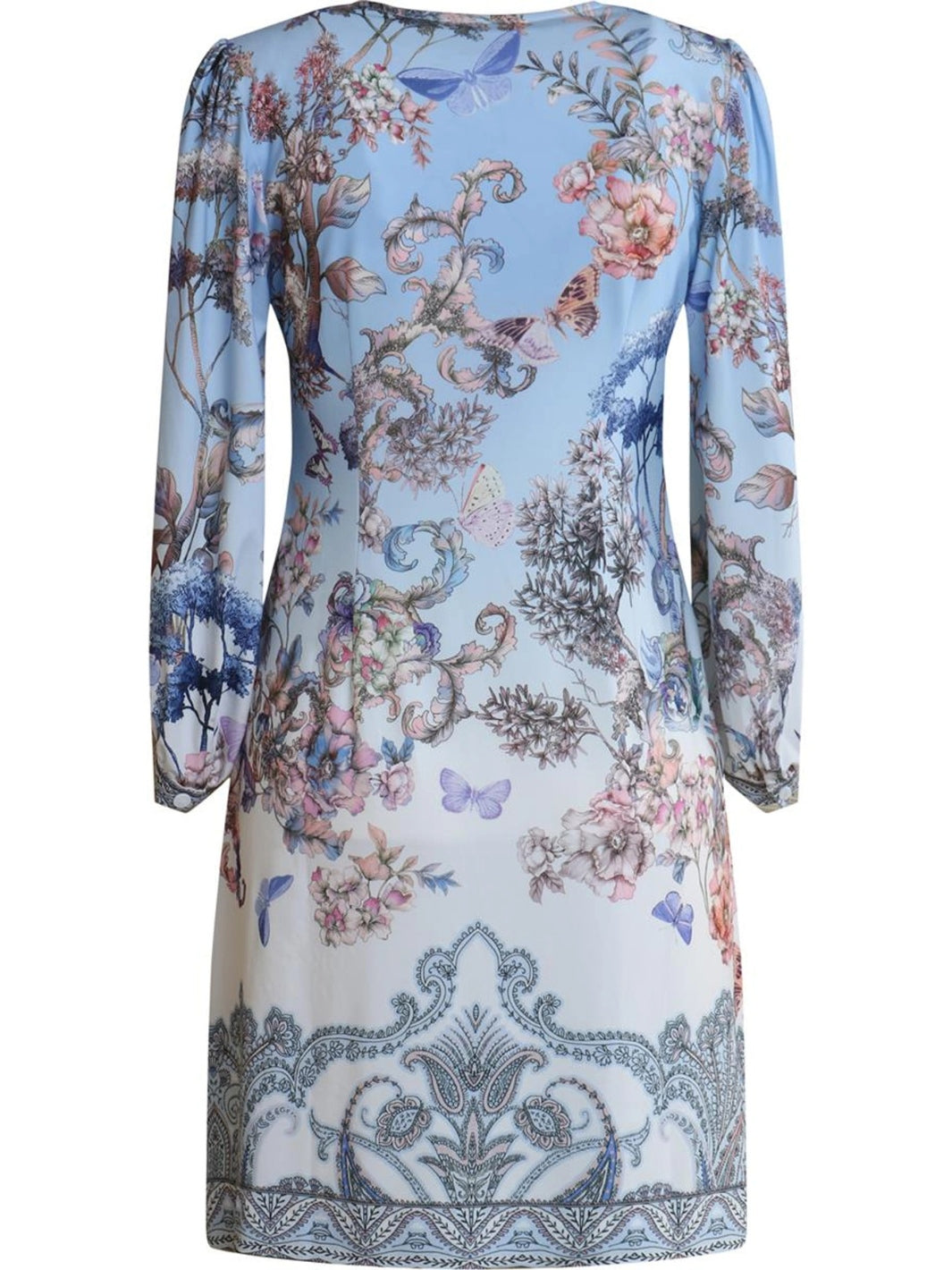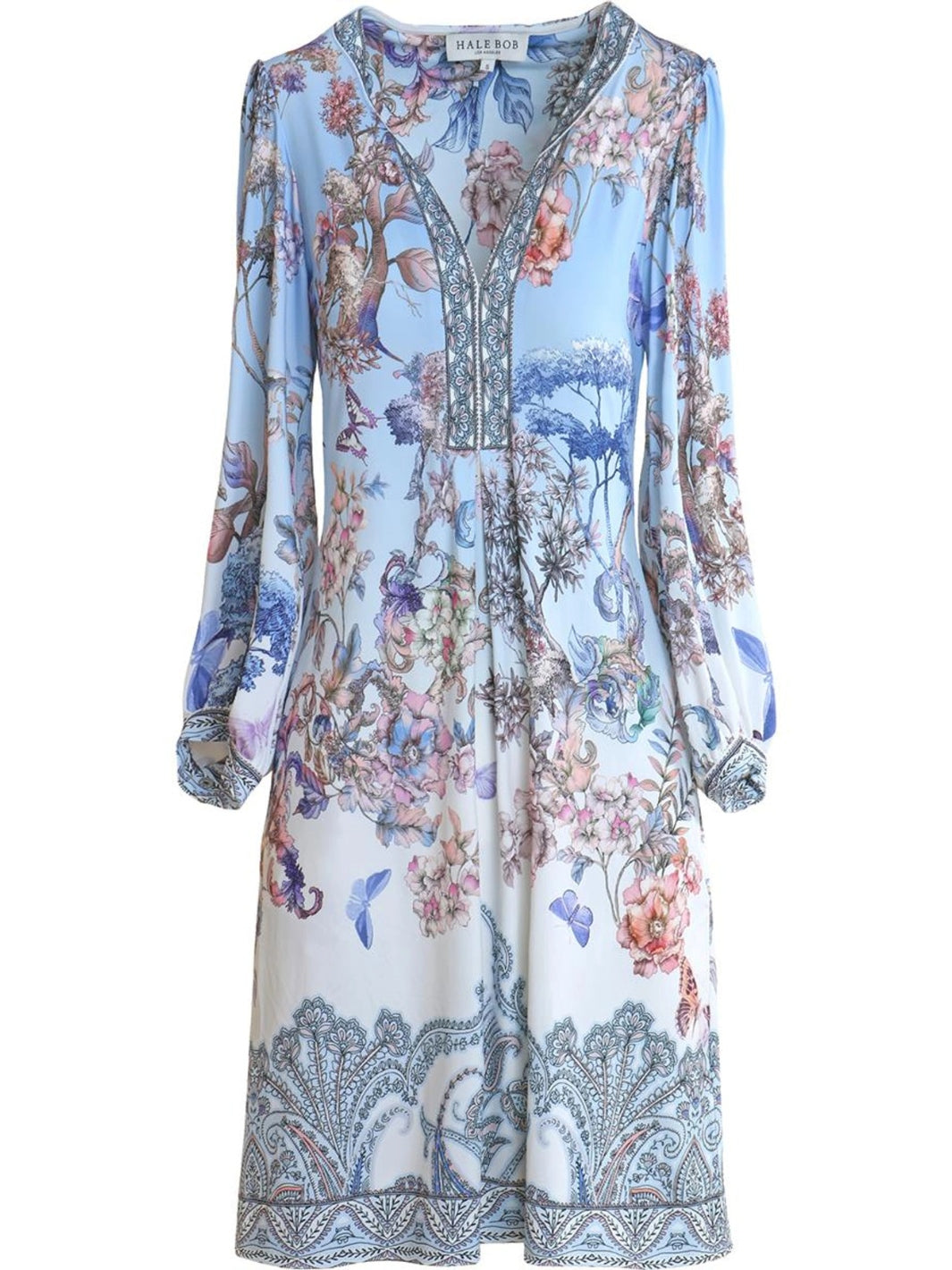 Maisy Dress fra Hale Bob. En kort blå kjole med lange ermer og v-hals. detaljert med et sommerlig print.