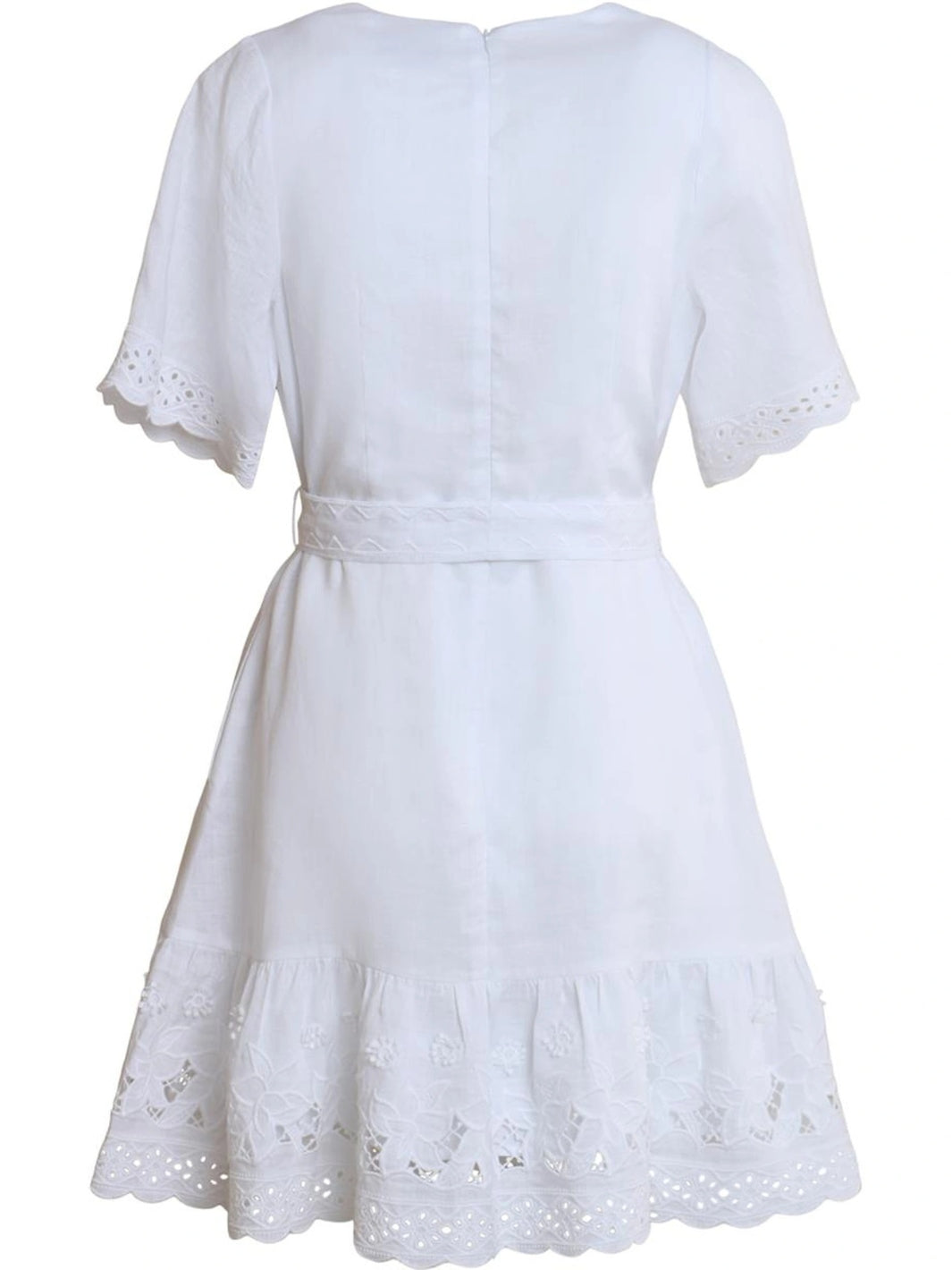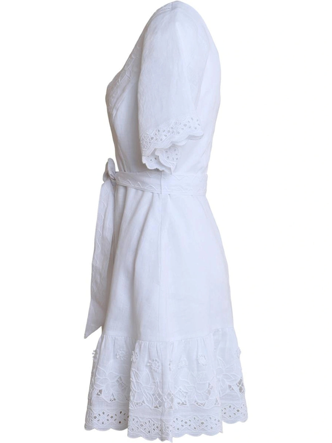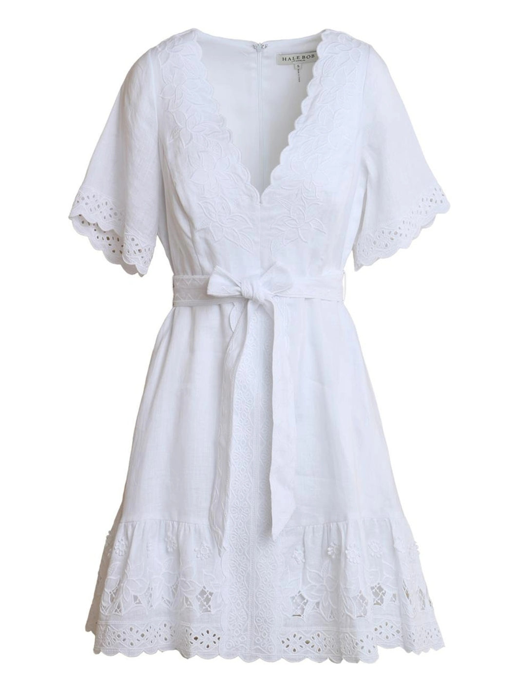 Azure Dress fra Hale Bob. En kort, hvit kjole med v-hals, knytebelte, og blondedetaljer.