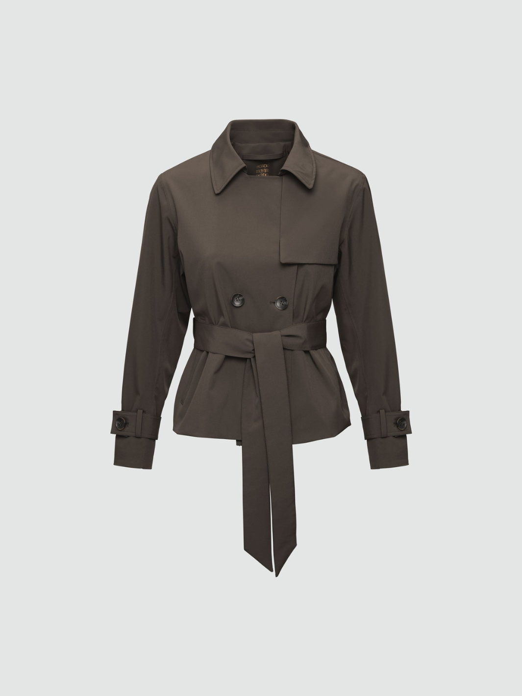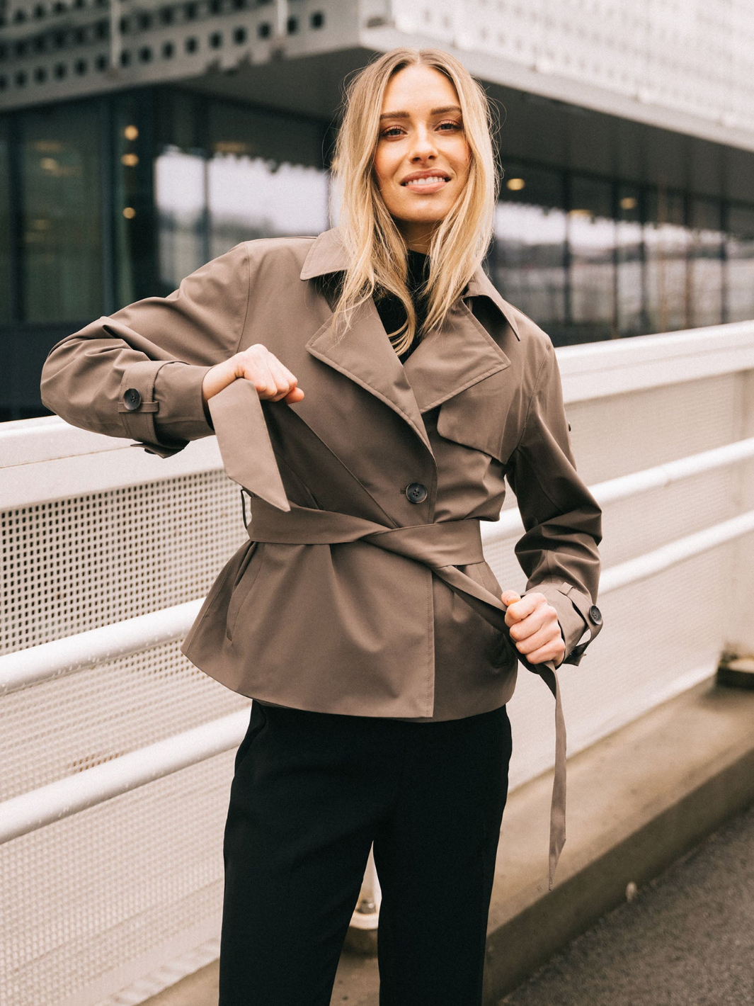 Node ll Trenchcoat fra Scandinavian Edition. En kort og moderne versjon av den klassiske trenchcoaten, her i brun. Med teipede sømmer er jakken 100% vann- og vindtett, og passer perfekt for mildt overgangsvær. Den har et midjebelte som er perfekt for personlig justering og styling.