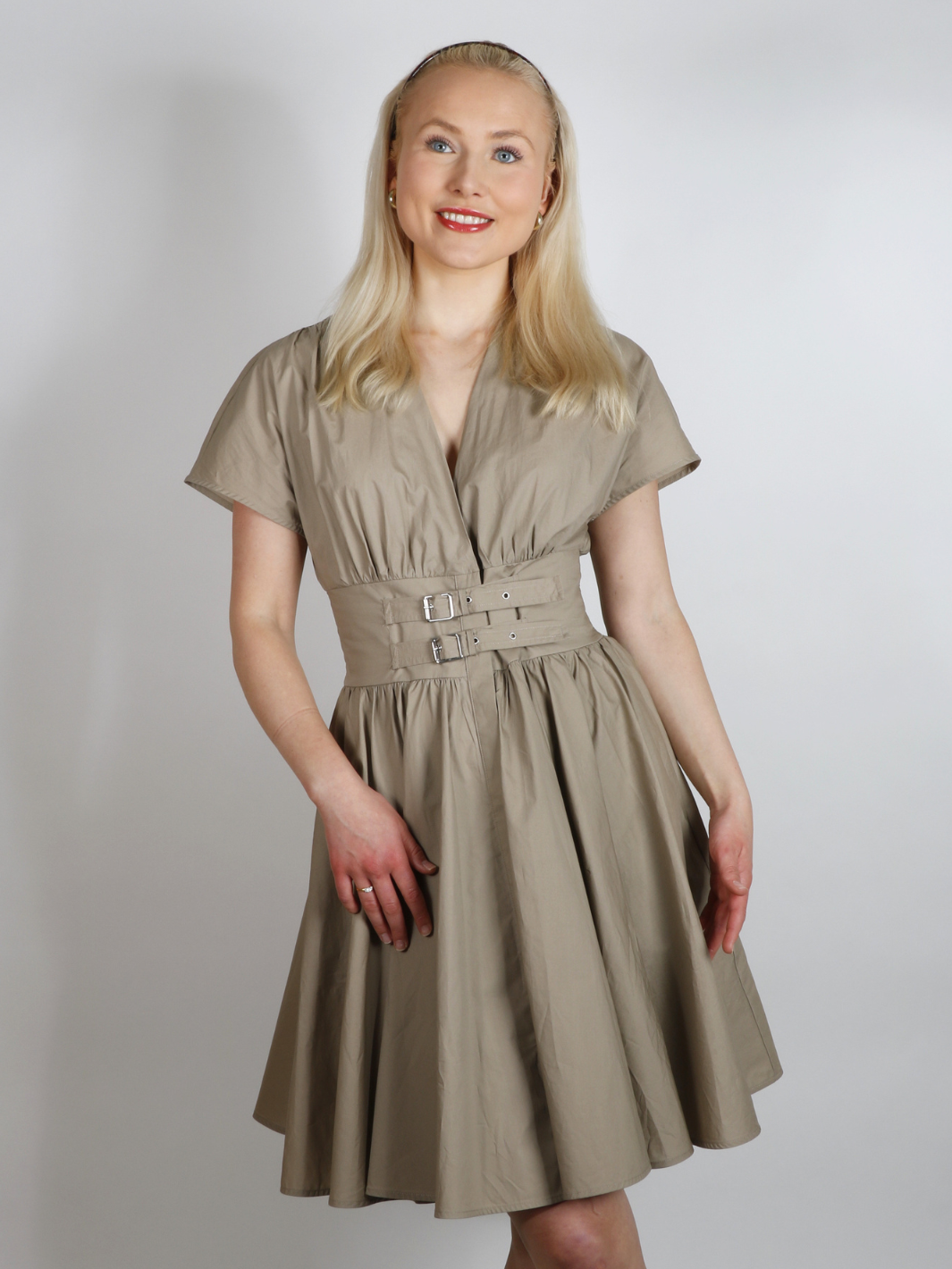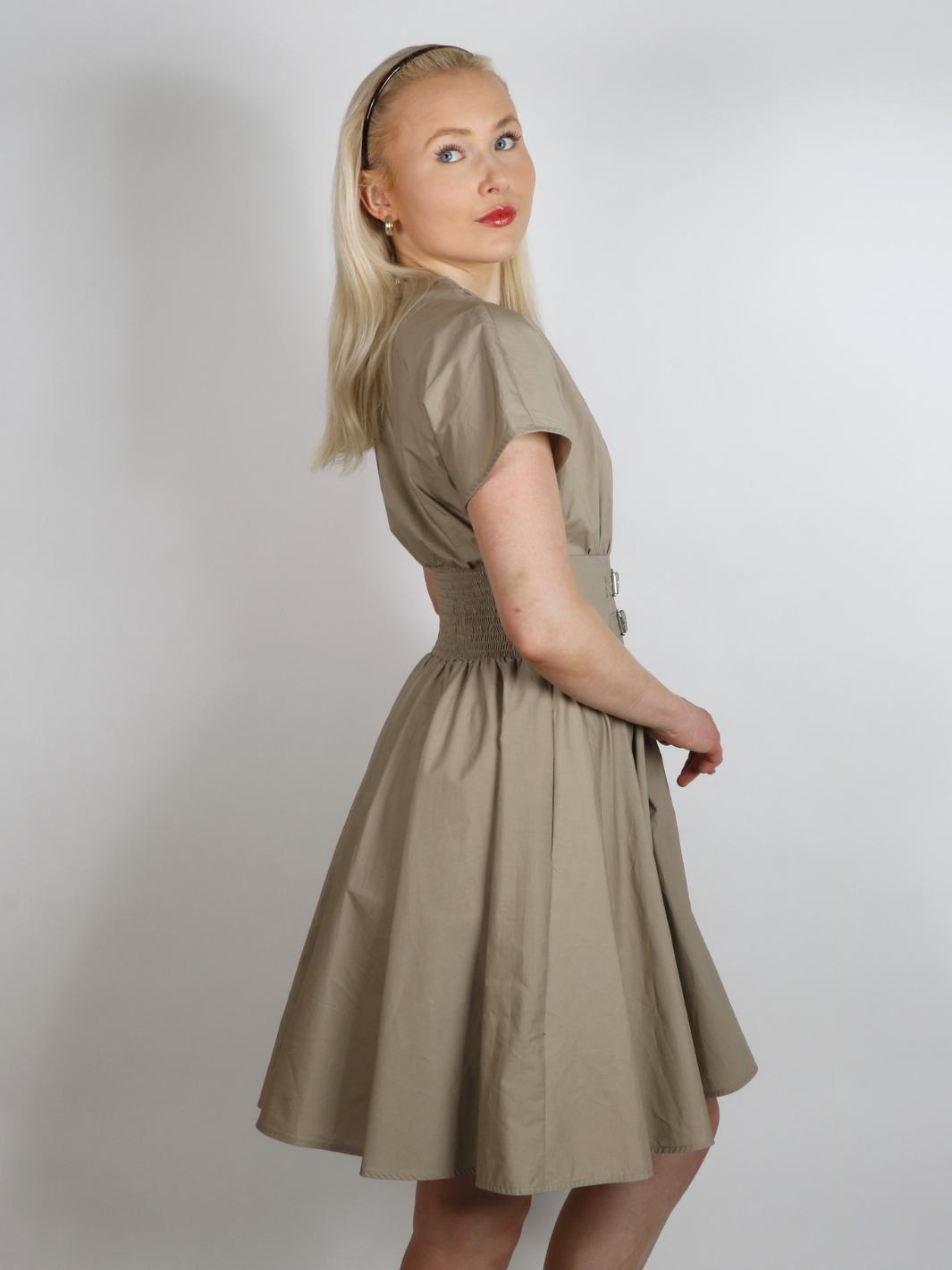 Dress fra MeiMeij. En beige kjole med v-hals og a-formet silhuett. Kjolen er detaljert med to spenner i midjen.