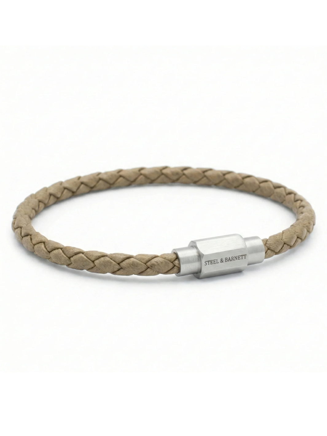 Leather Bracelet fra Steel & Barnett. Et beige smalt flettet armbånd, laget av 100% nappa lær. Armbåndet har en lukkemekanisme i front med inngravert logo, laget av rustfritt stål.