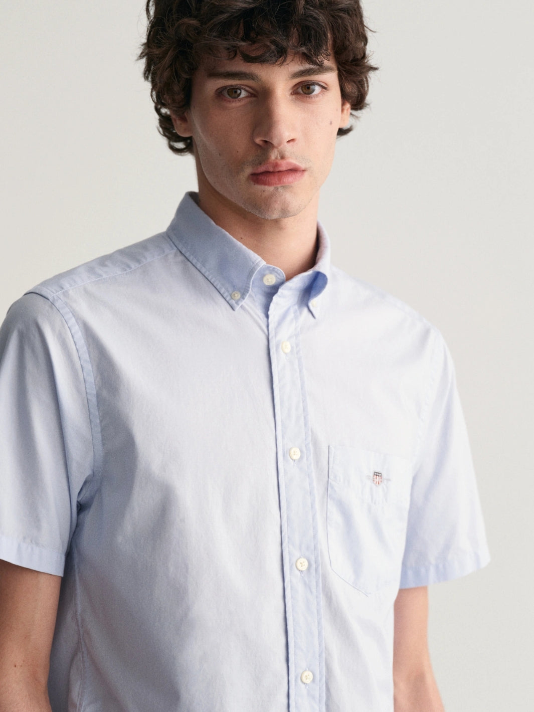 Reg Classic Poplin Gingh Shirt fra GANT. En lys blå skjorte med korte ermer og button-down krage. Detaljert med en brystlomme med logo.