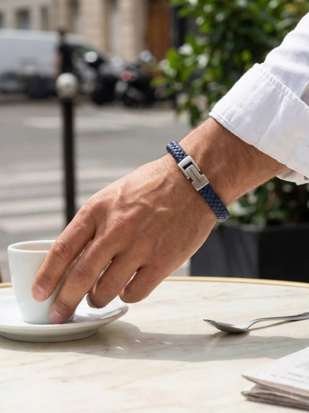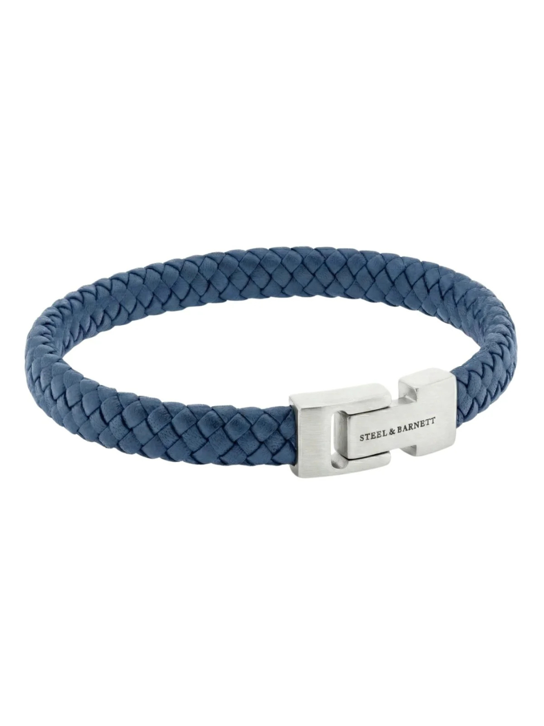 Leather Bracelet fra Steel & Barnett. Et blått flettet armbånd, laget av nappa skinn. Armbåndet har en lukkemekanisme i front av rustfritt stål.
