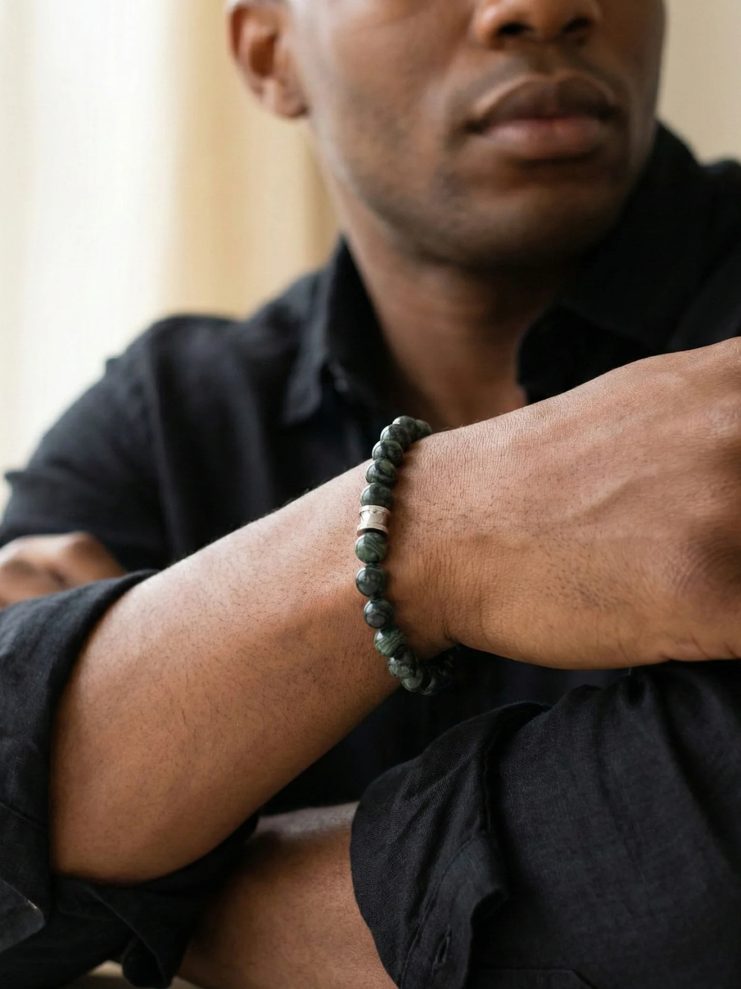 Stones Bracelet fra Steel & Barnett. Et elastisk armbånd med grønne jasper steiner. Steinene er kjent for å roe nerver og redusere frykt.