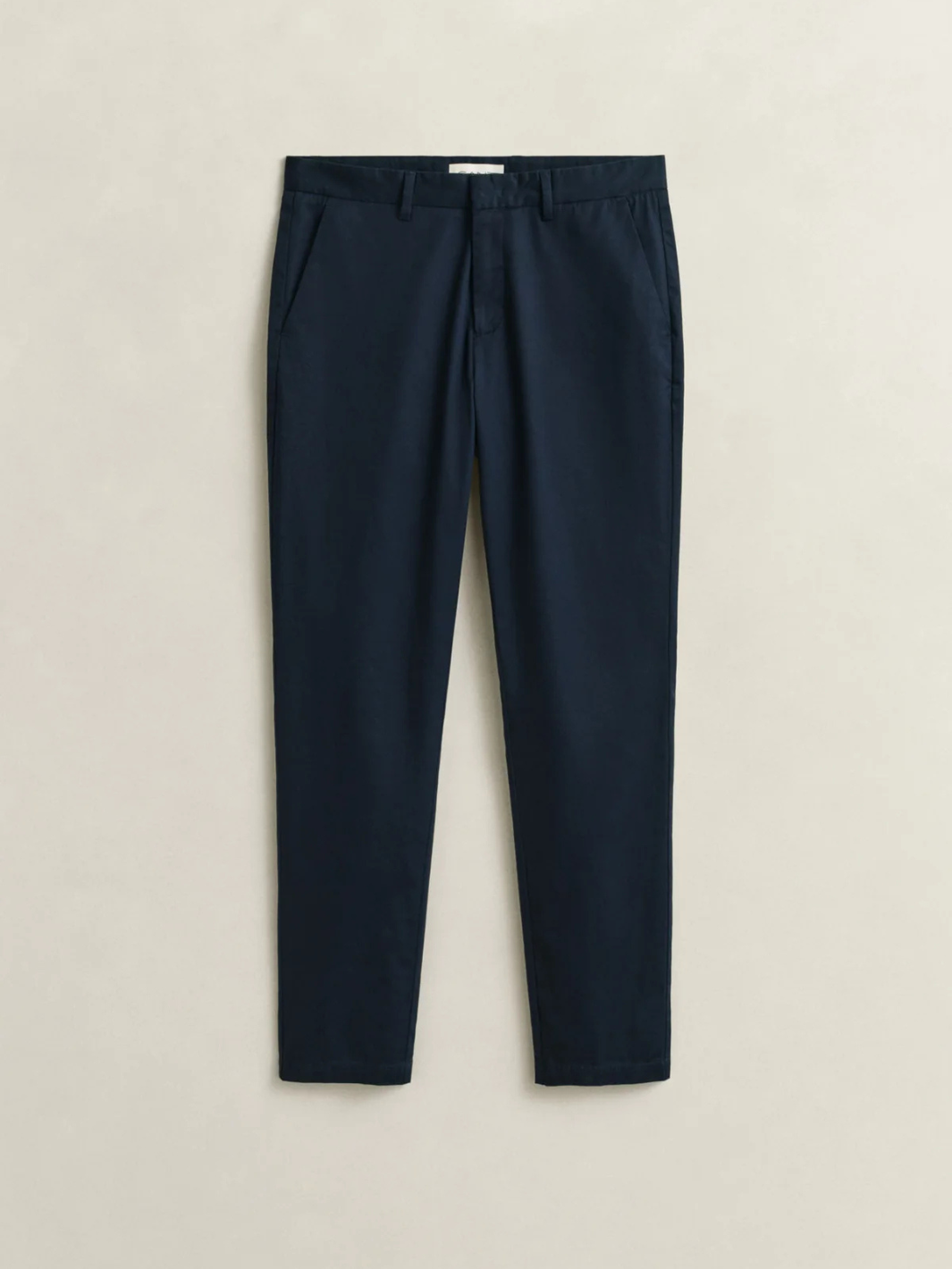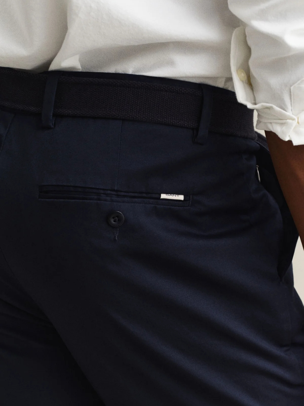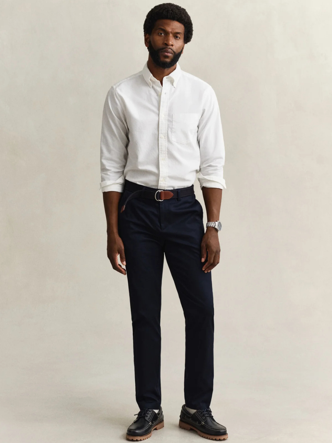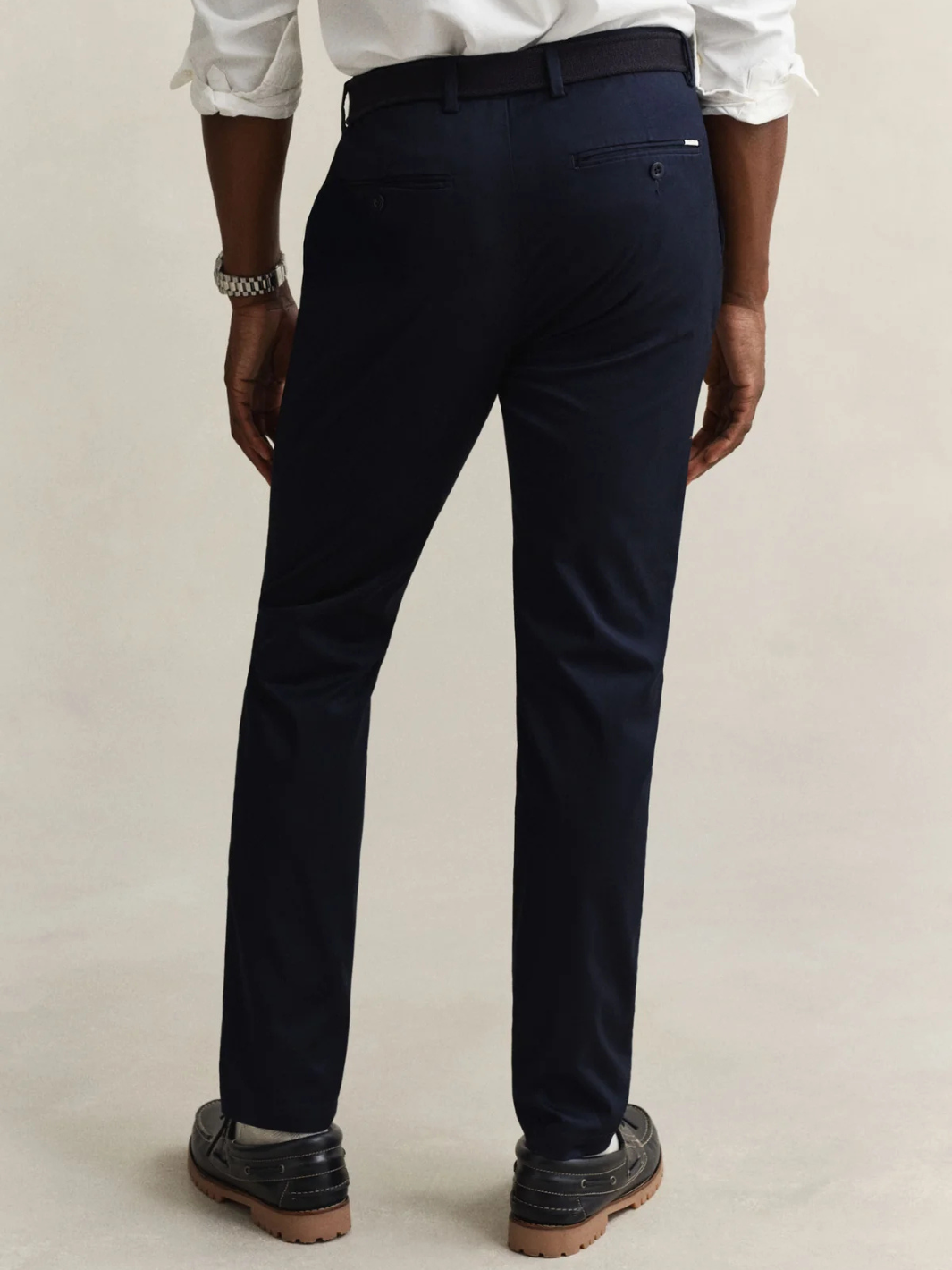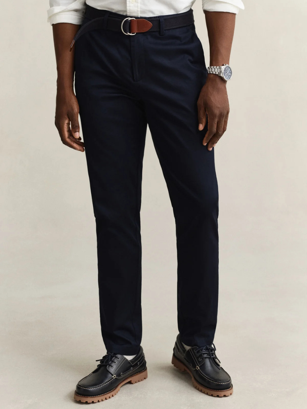Slim Sport Chinos fra GANT. Det perfekte buksevalget for en moderne og stilbevisst garderobe. Disse sorte buksene kombinerer komfort med en slank passform, noe som gjør dem ideelle for både avslappede og mer formelle anledninger.