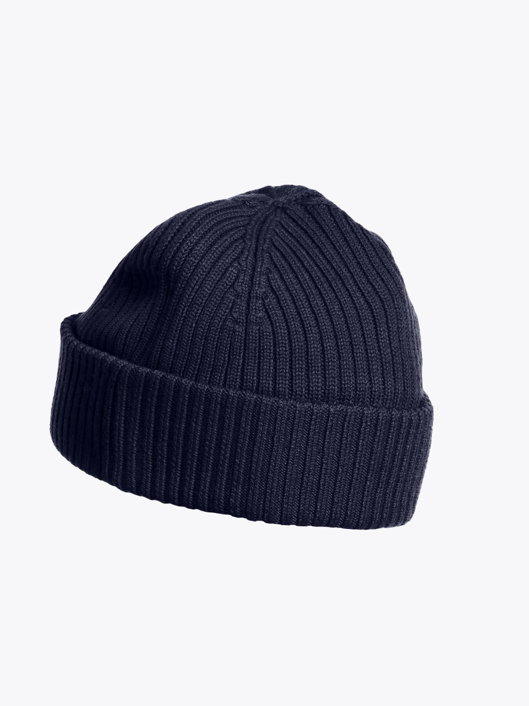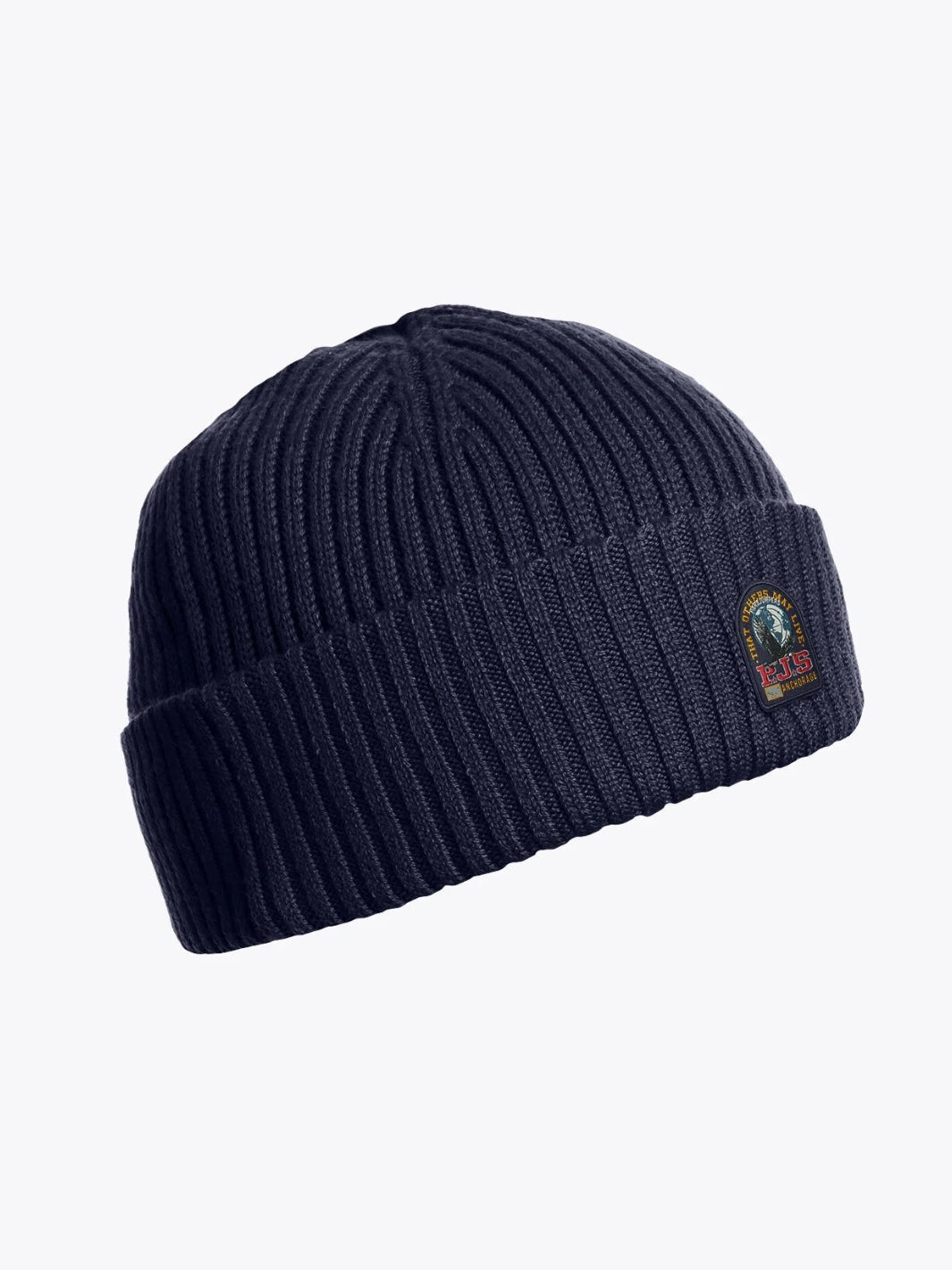 Rib Hat fra Parajumpers. Marineblå ribbestrikket lue, laget i en merinoull blanding. Luen har en klassisk Parajumpers logo-patch i front.