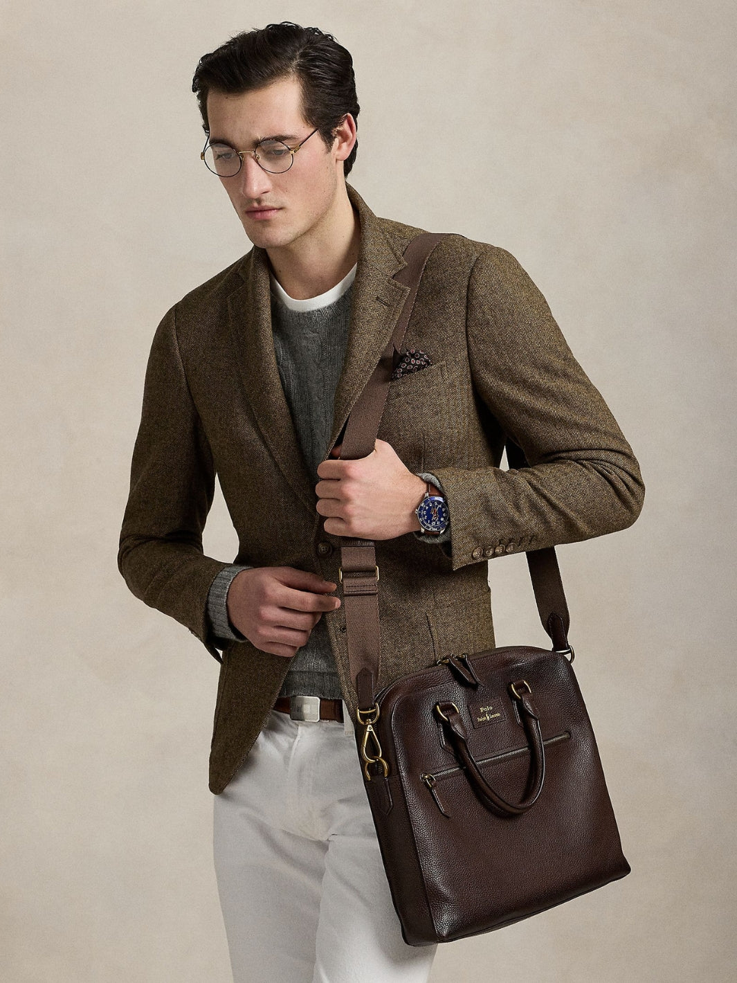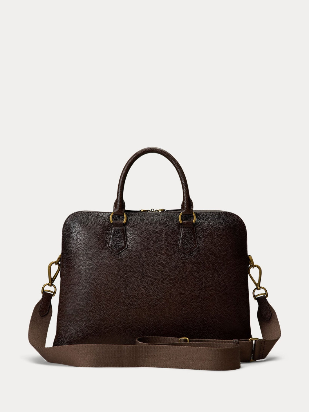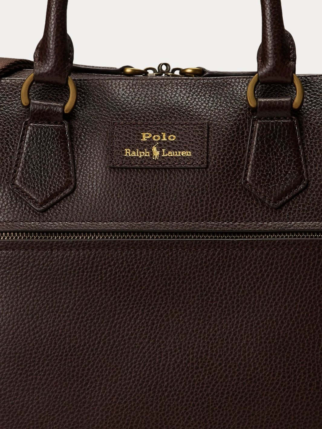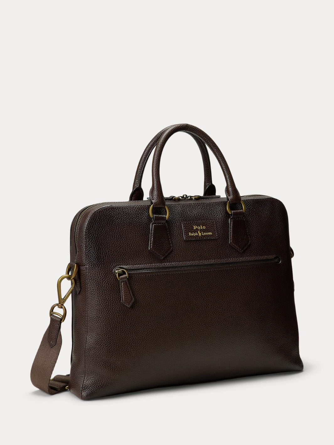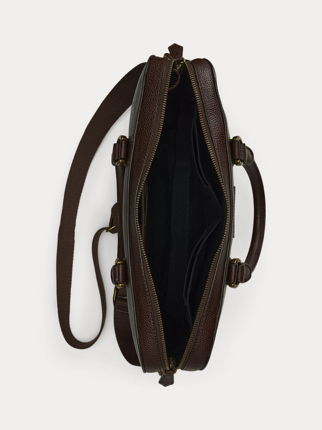 Pebbled Leather Commuter Bag fra Polo Ralph Lauren. En stilren skulderveske, her i brun. Vesken har flere lommer, inkludert en frontlomme med glidelås og polstret laptop-lomme. Det følger med avtagbar og justerbar skulderrem.
