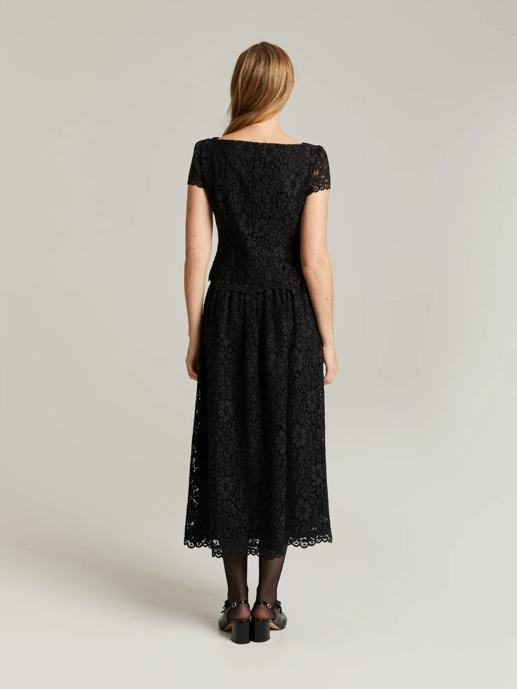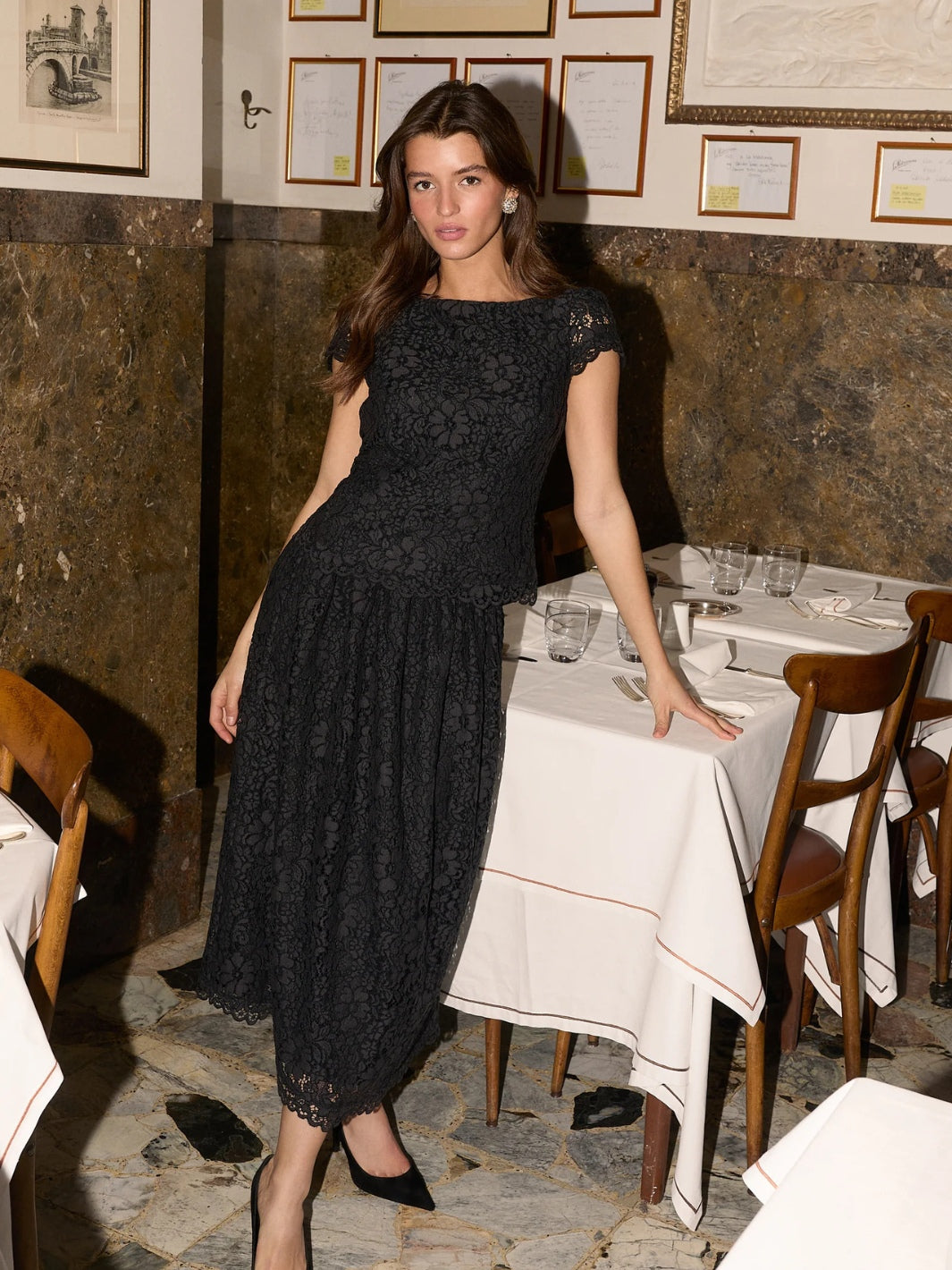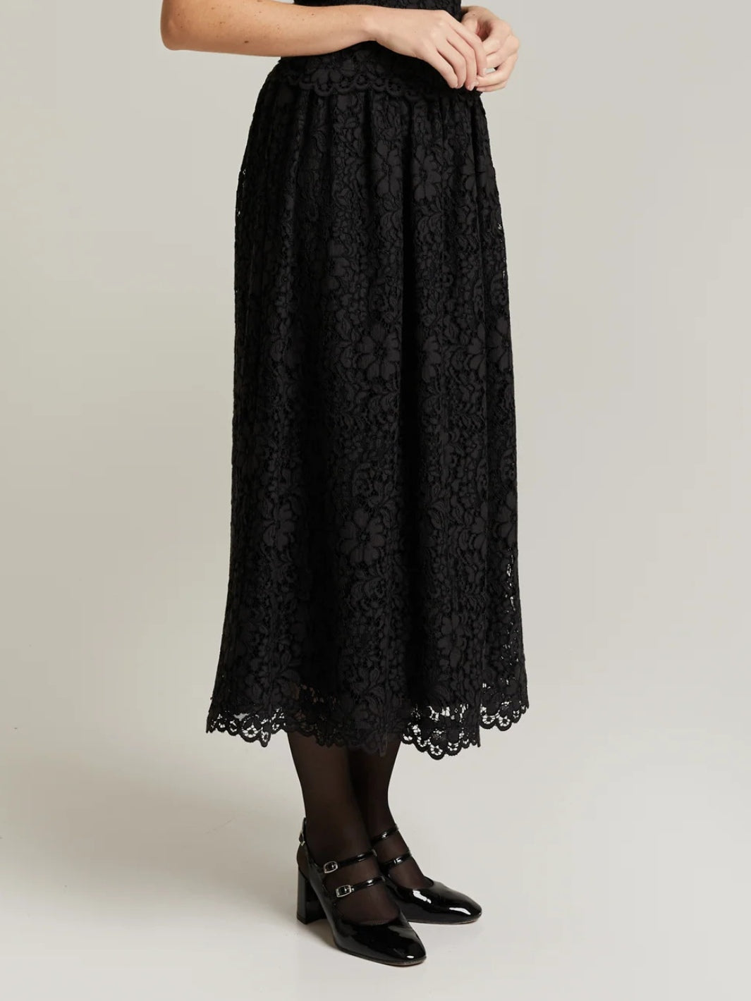 Jen Skirt fra Andiata. Et langt sort blondeskjørt, med glidelås bak og fôring på innsiden. Det feminine snittet gir en tidløs og flatterende passform. Kombiner gjerne med Anrid Top.