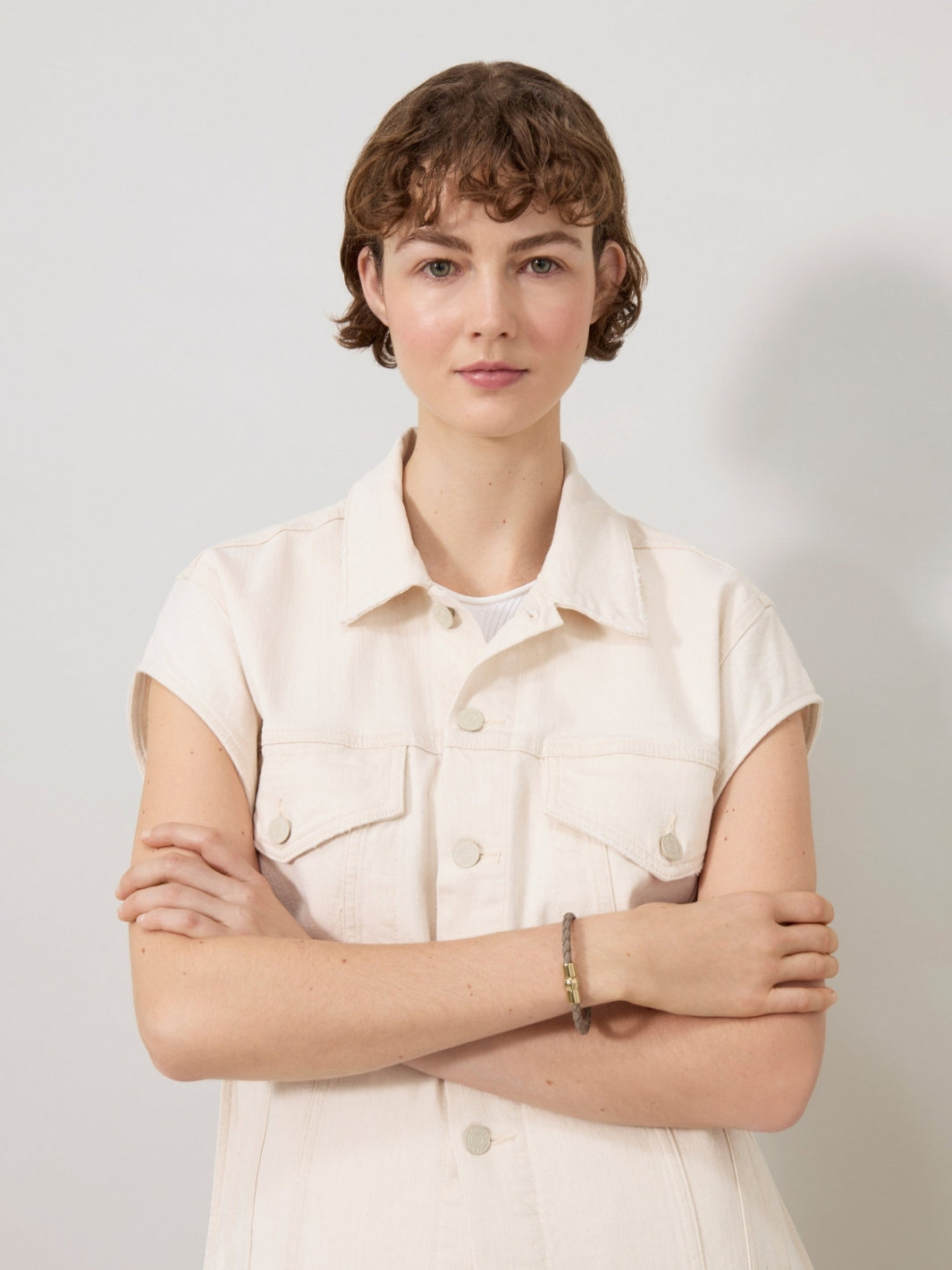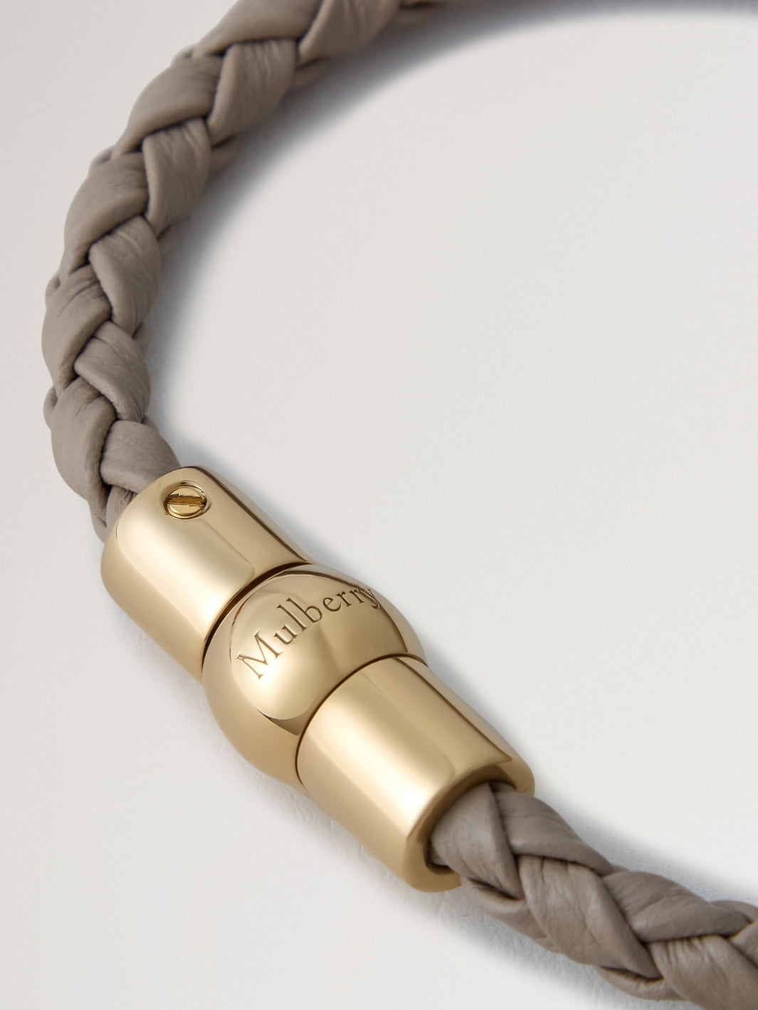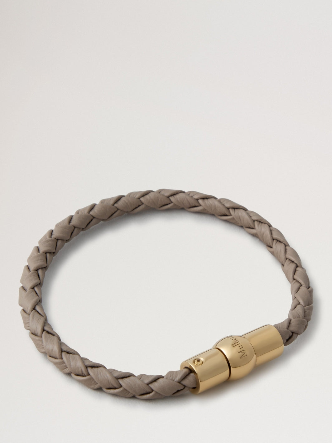 Iris Leather Bracelet fra Mulberry. Et nydelig gråbrunt armbånd i skinn med vevd motiv og magnetisk metallukking.
