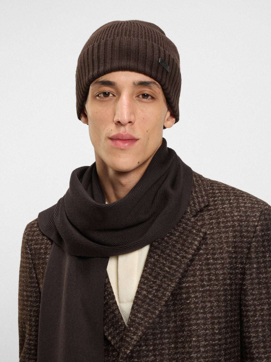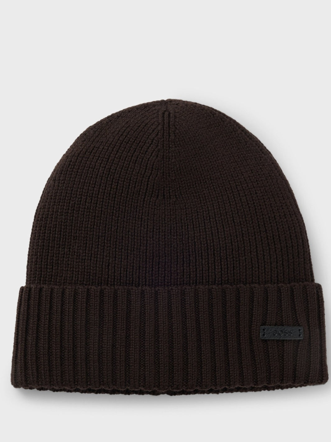 Fati Ribbed Beanie fra BOSS. Ribbestrikket lue med diskret BOSS logo på siden, her i brun. Luen er laget av 100% Virgin ull for ekstra komfort og varme.