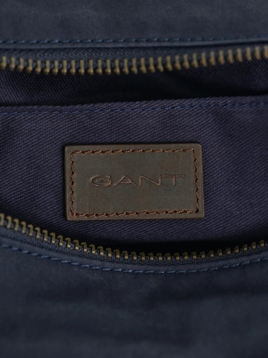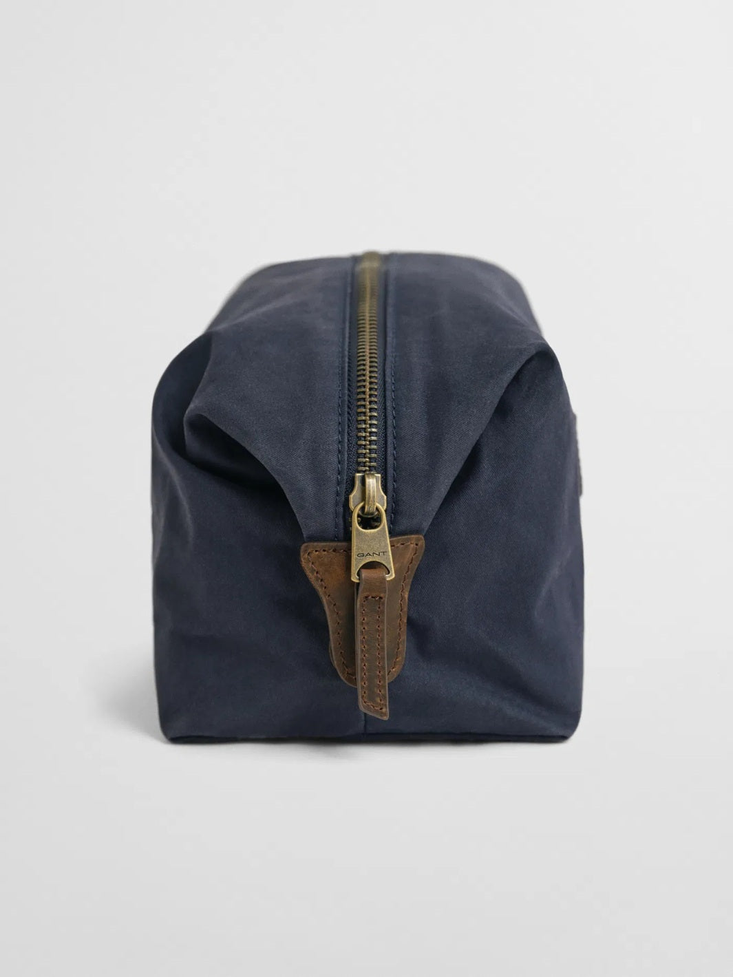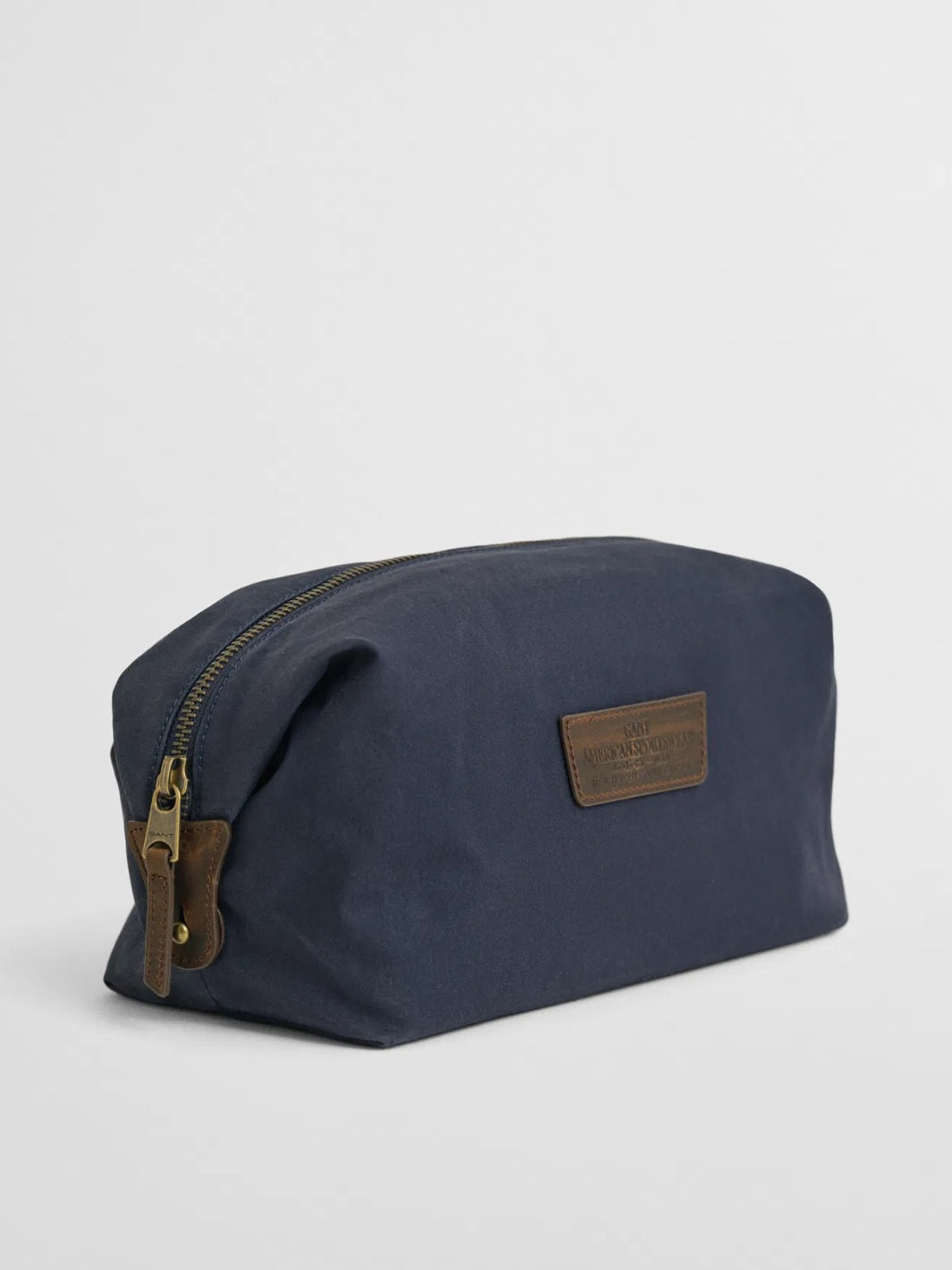 Waxed Cotton Washbag fra GANT. Toalettmappe i bomullsblanding med tørr voksoverflate. Perfekt til reise og hverdagsbruk, med glidelås i metall, skinnlogo foran og skinn-detaljer.