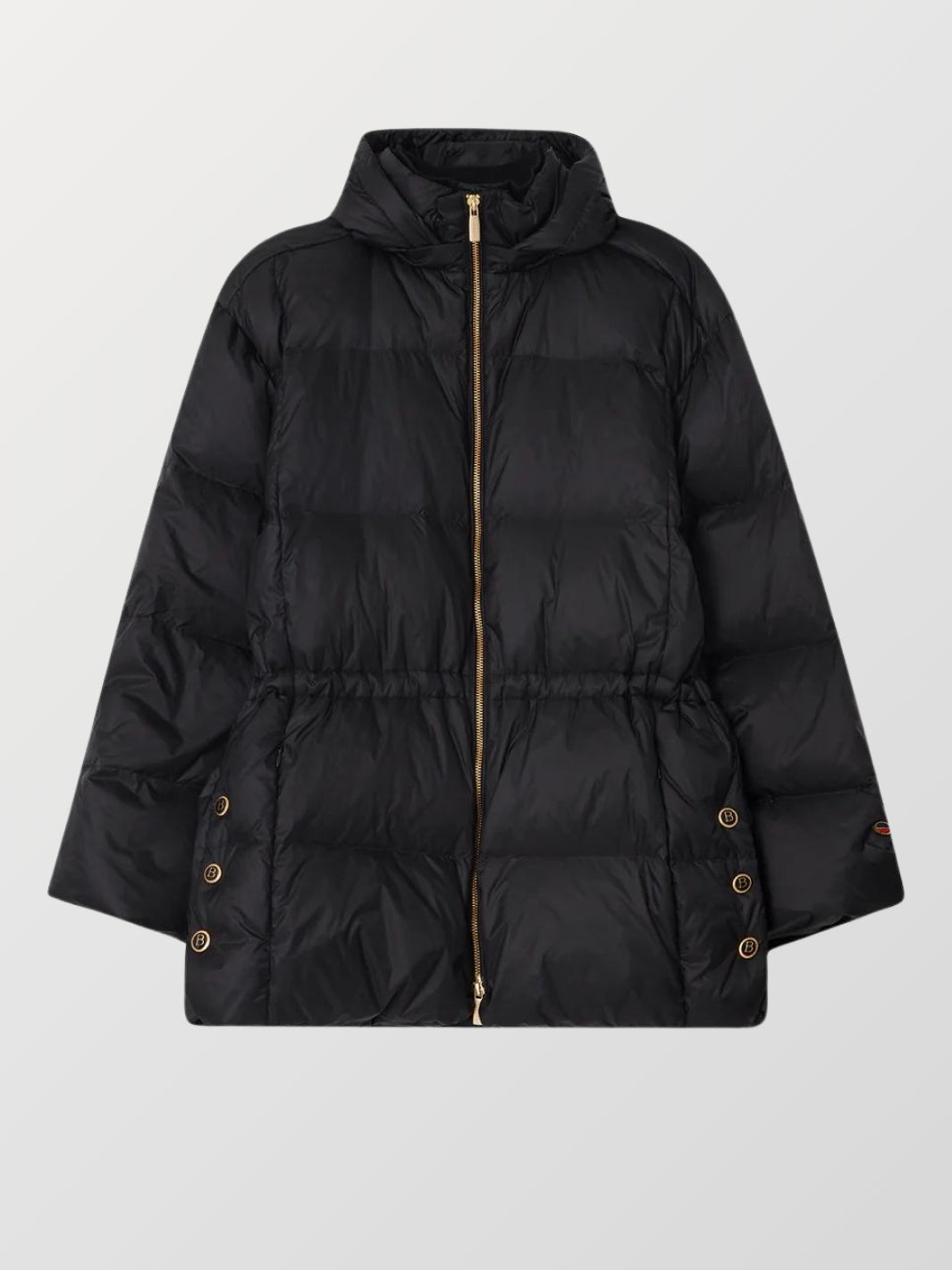 Melody Down Jacket fra Busnel. En sort jakke med dobbel glidelås, to sidelommer og tre emaljerte B-knapper på hver side. Jakken er laget av vannavstøtende materiale og har avtagbar hette.
