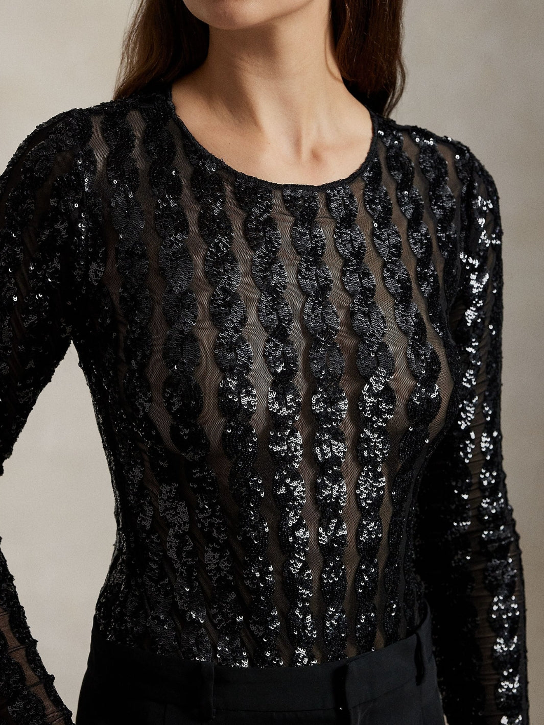 Cable-Sequin Mesh Bodysuit fra Polo Ralph Lauren. En luksuriøs body i transparent stretchmesh med paljettbroderi i kabelstrikk-inspirert mønster. Bodyen har pull-on-stil med trykknapper i skrittet.