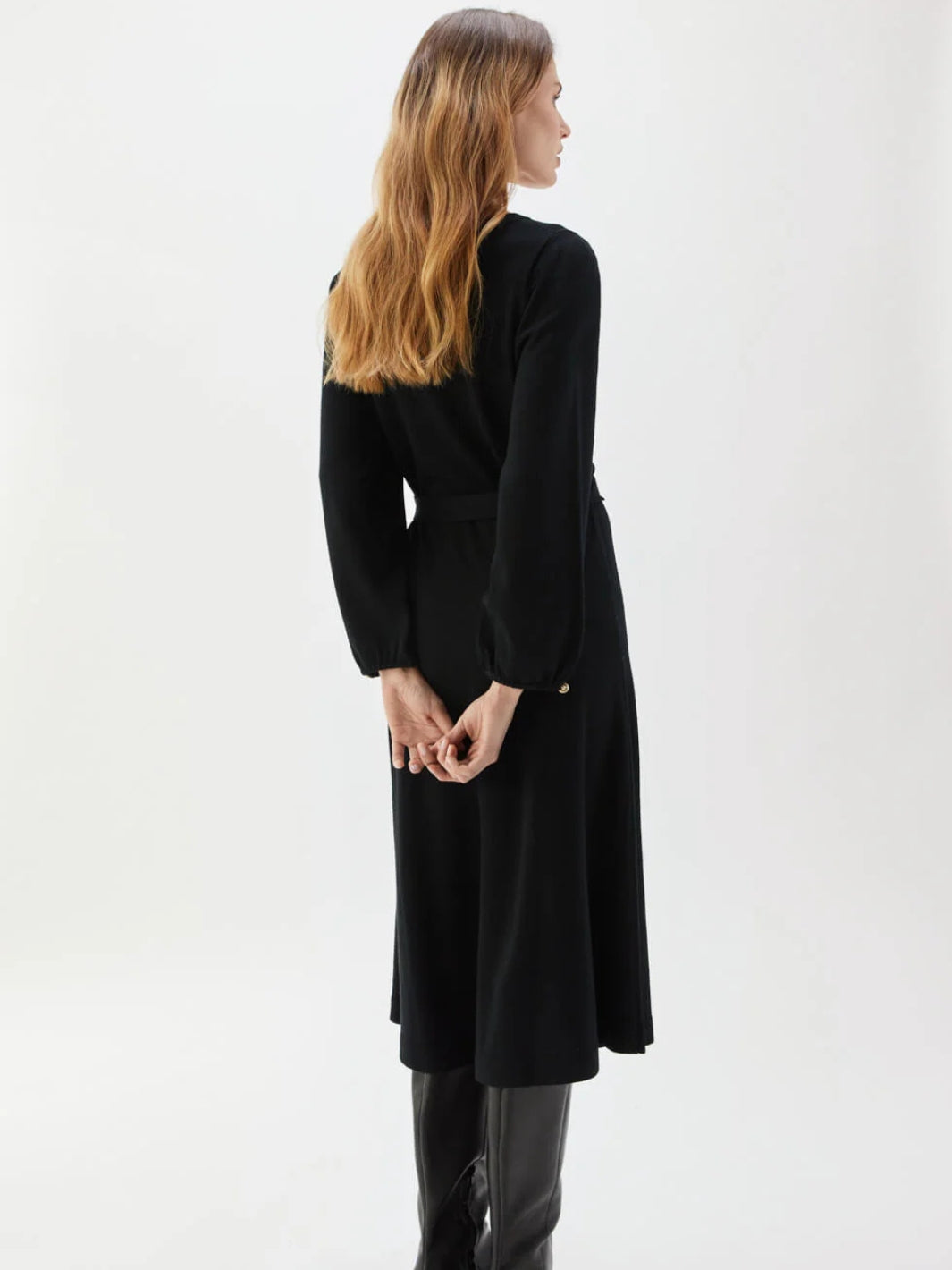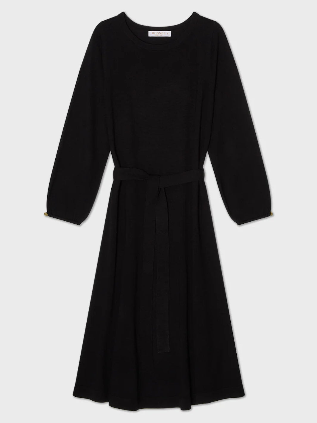 Eden Dress fra Busnel. En sort kjole, strikket i myk merinoull. Kjolen har belte i midjen.