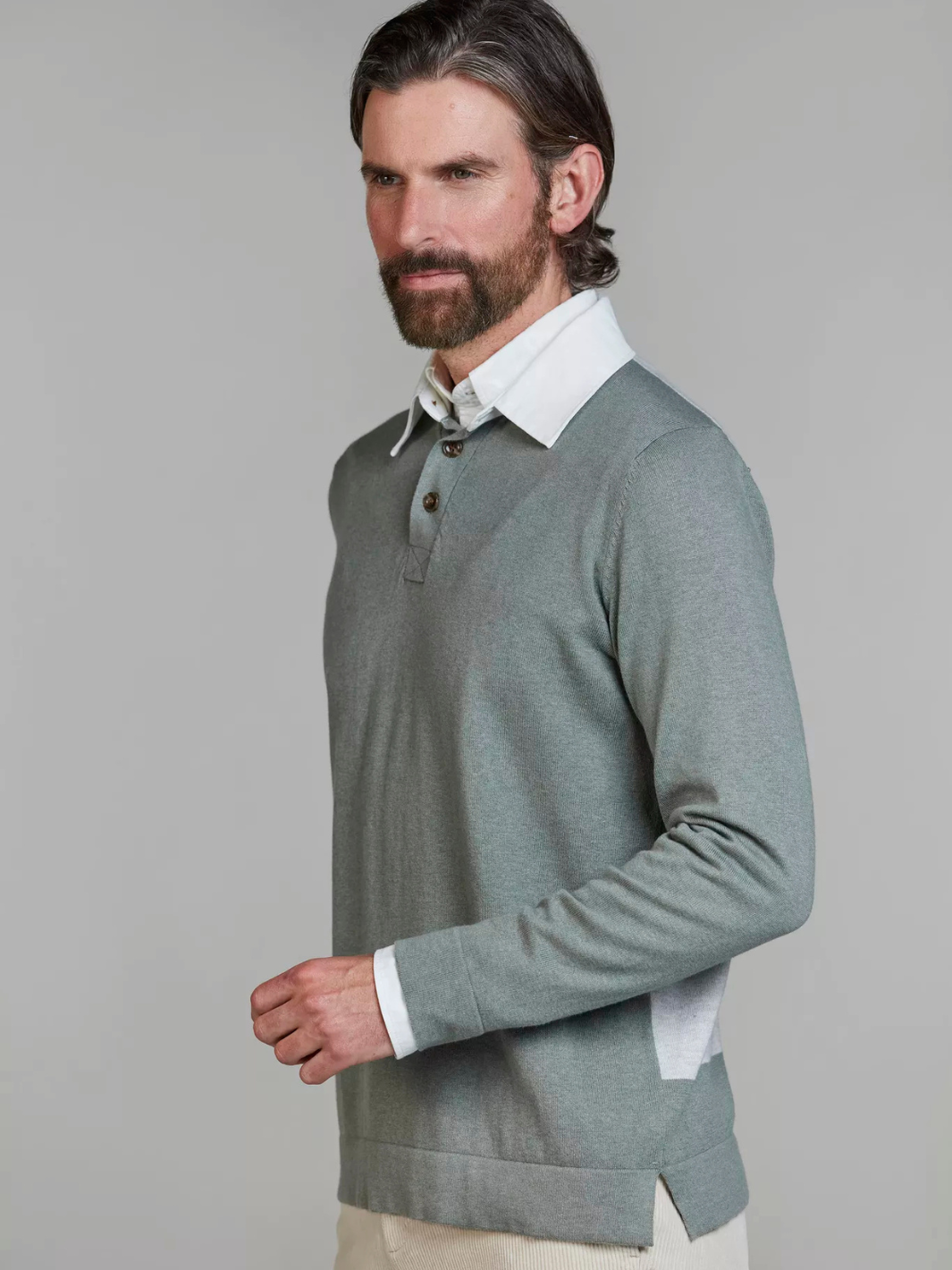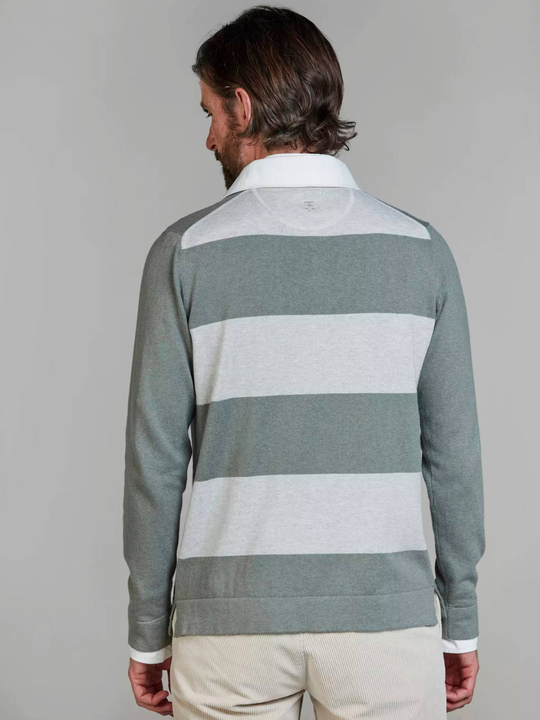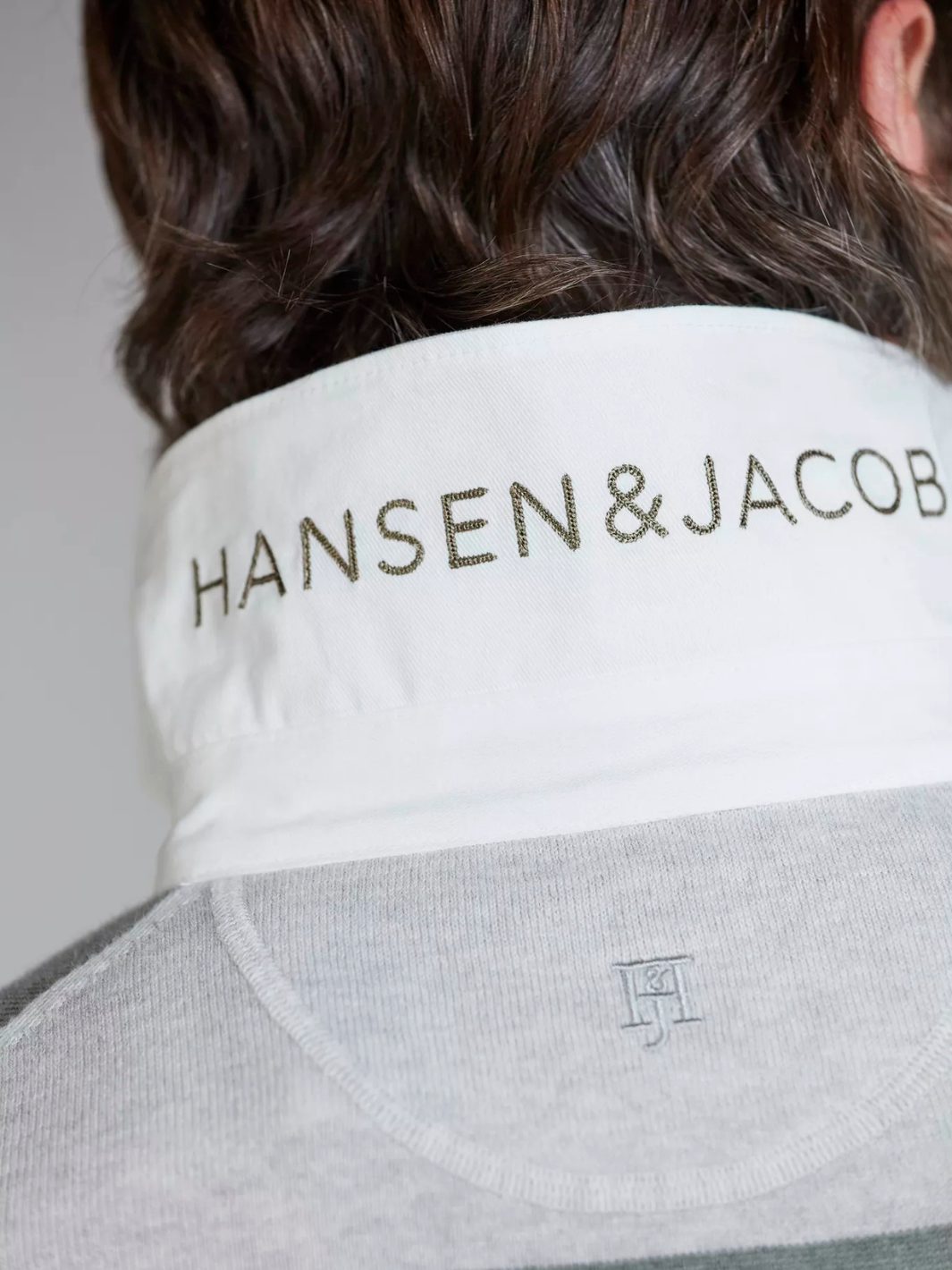 Rugger Knit fra Hansen & Jacob. En strikket grønn genser med krage og knappestolpe, kombinert med et tidløst rugger-utseende.