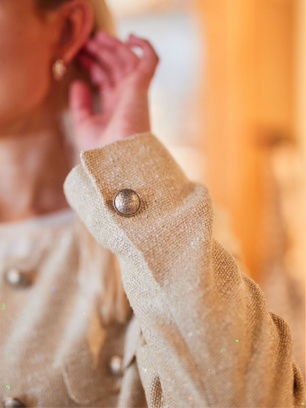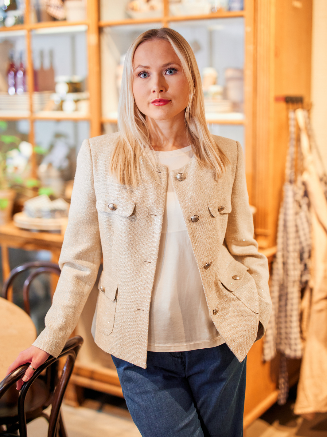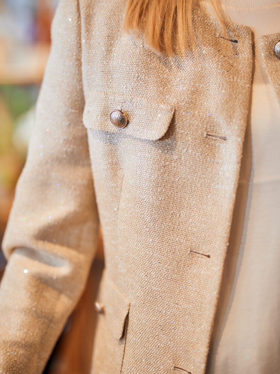 Jodie Blazer fra Tagliatore. En klassisk beige jakke detaljert med fire lommer og store gullknapper. Jakken har lekre paljetter.
